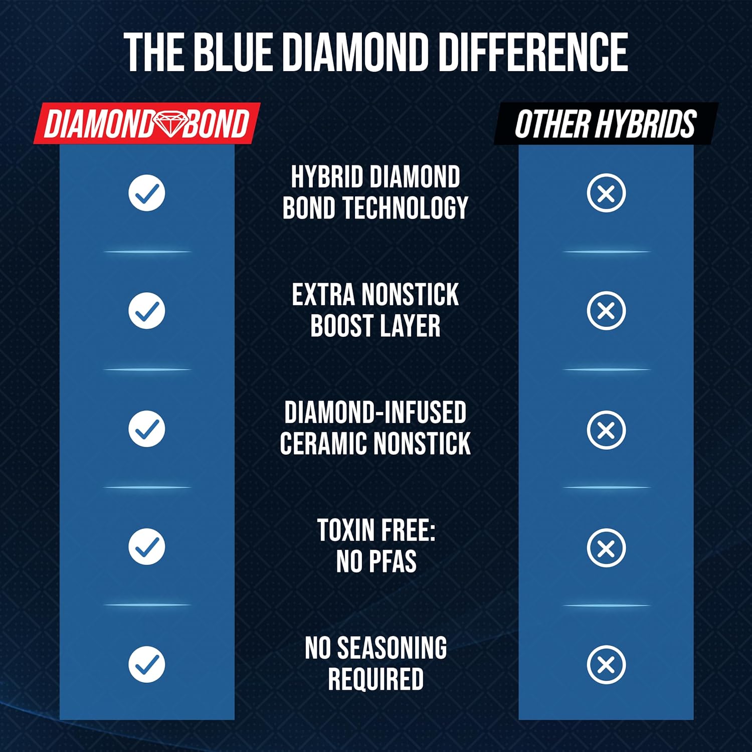Blue Diamond, America’s #1 frypan, meets a revolutionary new Diamond Bond Technology—a fusion of 3-ply stainless steel, a game-changing ceramic nonstick, and a unique raised diamond texture. This collection boasts 10X more metal utensil safe durability, thanks to the diamond-infused, PFAS-free ceramic nonstick that delivers incredible scratch-resistance and healthier meals. The engraved diamond pattern works with the multilayered construction to provide 6X faster heat response and allows food to lift out of fats for perfect searing and glide-off-the-pan results. Plus, it offers 4X more nonstick performance for effortless releases every time. The chip-free rims ensure mess-free pouring, while the stay-cool stainless steel handles give you complete control. Whether you’re using induction, gas, or electric stovetops, Blue Diamond Diamond Bond works seamlessly on all surfaces, offering unmatched durability, versatility, and ease of use. With the ability to withstand high heat cooking up to 850˚F and being dishwasher safe for easy cleanup, this collection is the perfect choice for every home chef.