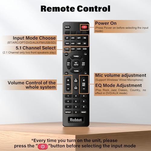 Simple Setup and Use: Three wired speakers connect to the “AUDIO OUTPUT” slots of the Subwoofer, two wireless speakers direcly provide power and turn on. Test the remote control and Bluetooth connection (Connect Bluetooth named “Bobtot KW79” on “BT” mode) to ensure the system is good status. Connet with any external device with matched cable and choose the matched INPUT mode.