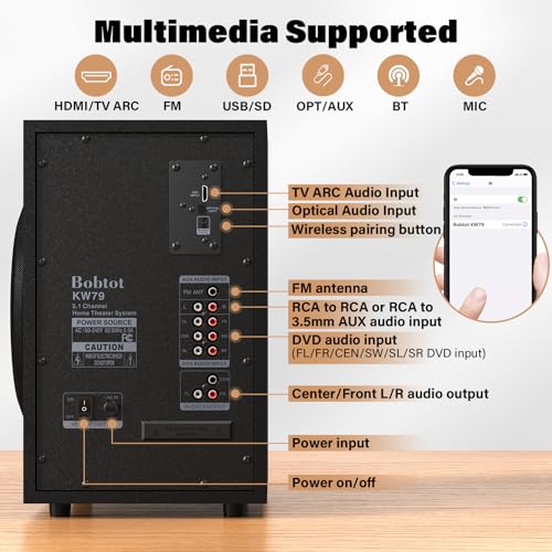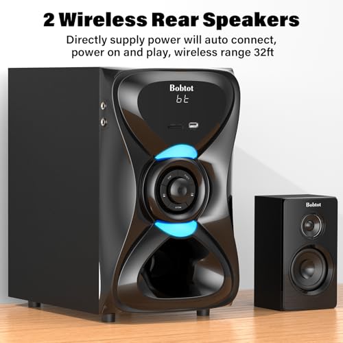 Bobtot Surround Sound Systems Wireless Rear Satellite Speakers – 1000W Peak Deep Bass 8 inch Subwoofer 5.1/2.1 Channel Home Theater System with ARC Optical Bluetooth Karaoke Input