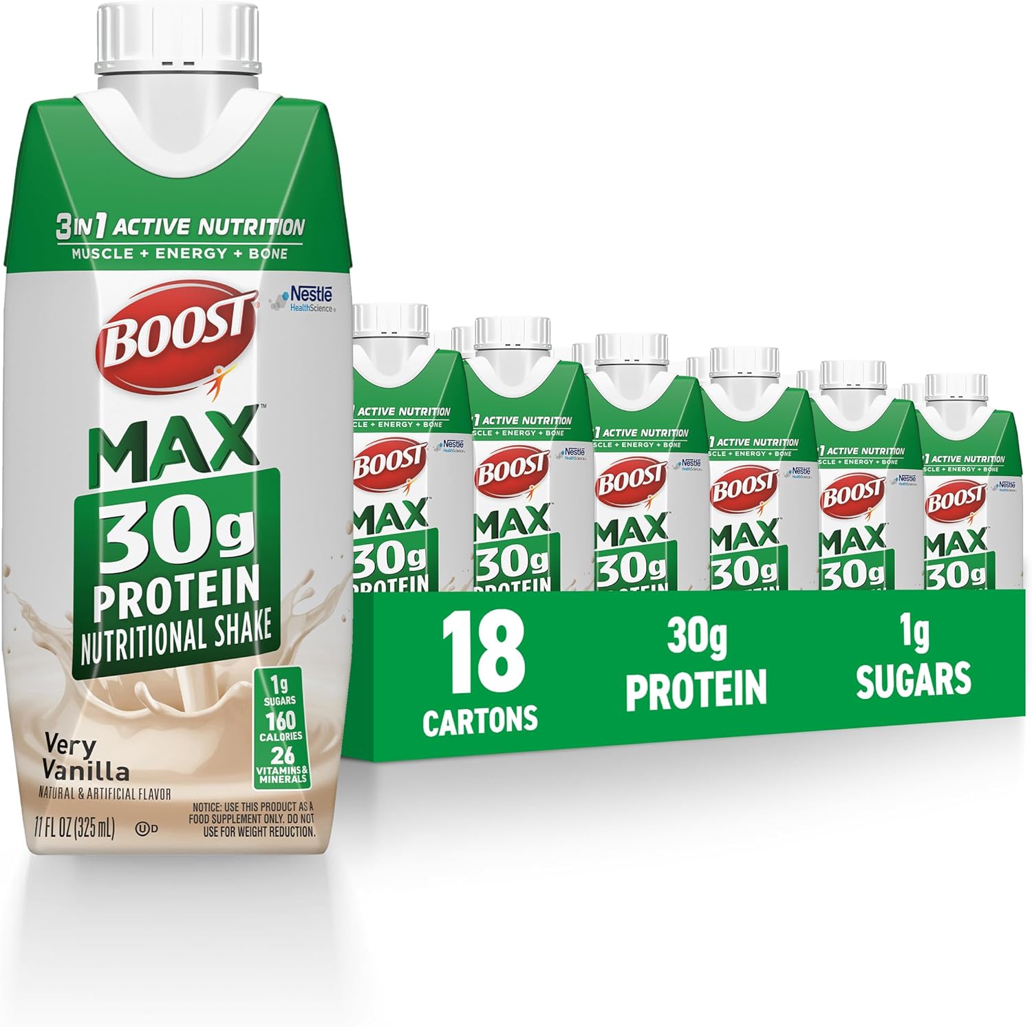 BOOST MAX Protein Shakes Ready to Drink – 30g High Protein Shake – Vanilla | Nutritional Drinks to Support Muscle Recovery After Exercise, 26 Vitamins & Minerals, 1g Sugar, 11 fl oz (Pack of 18)
