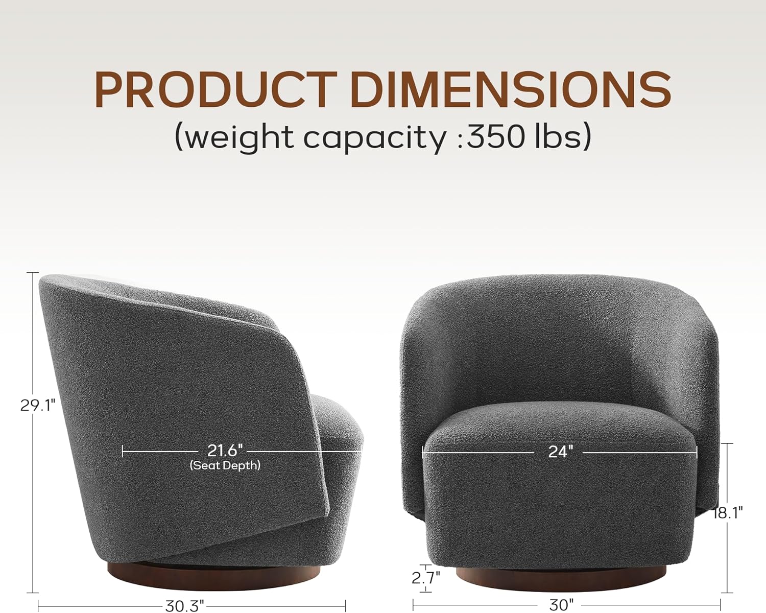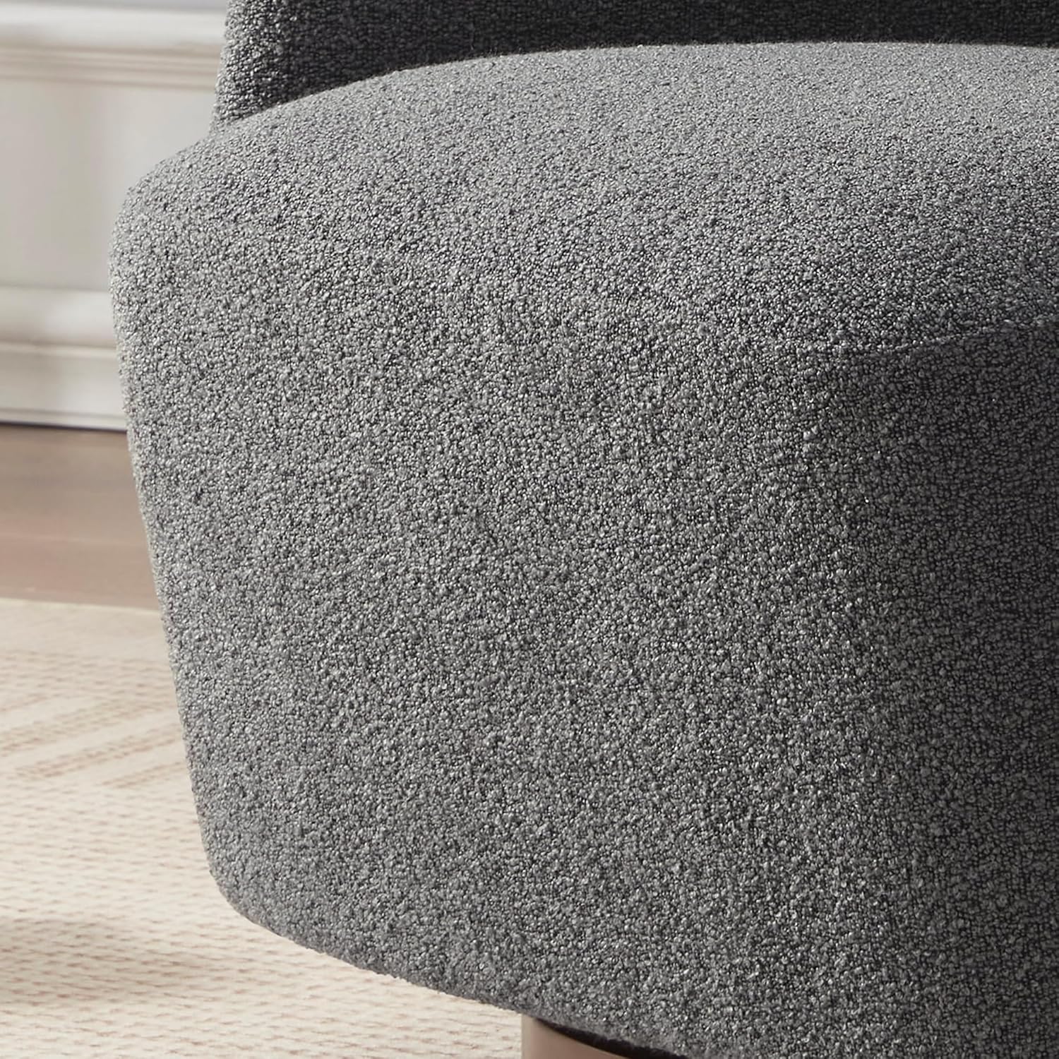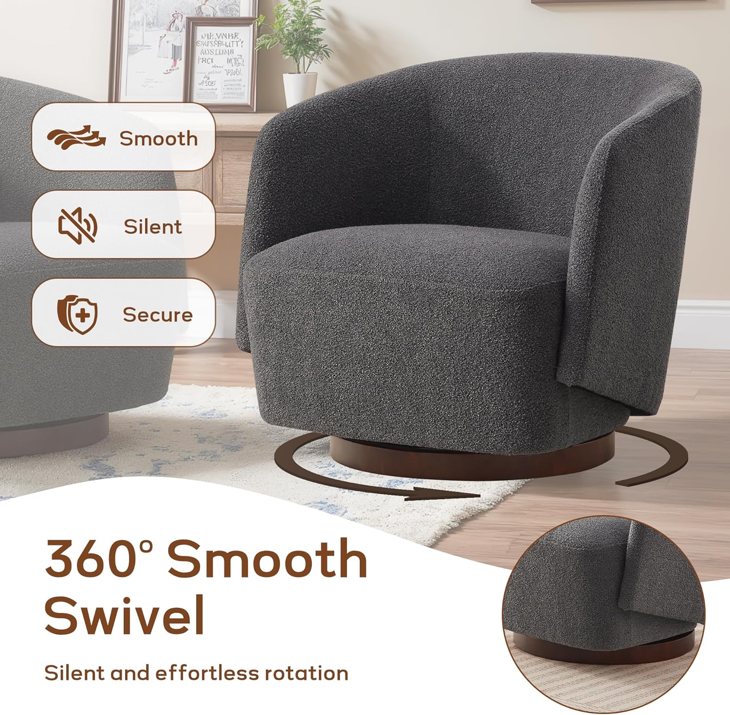 Solid Rubberwood Swivel Base: Built on a sturdy, natural rubberwood swivel base, this boucle swivel chair offers both strength and a warm, organic touch to modern interiors. No assembly required — simply unbox and enjoy