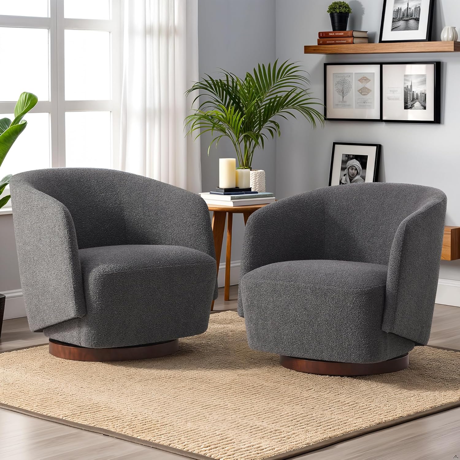 Boucle Swivel Accent Chairs Set of 2, No Assembly Upholstered Armchair with Rubberwood Base, 360° Rotating Living Room Chairs Set of 2 for Bedroom, Apartment & Reading Nook (2, Grey)