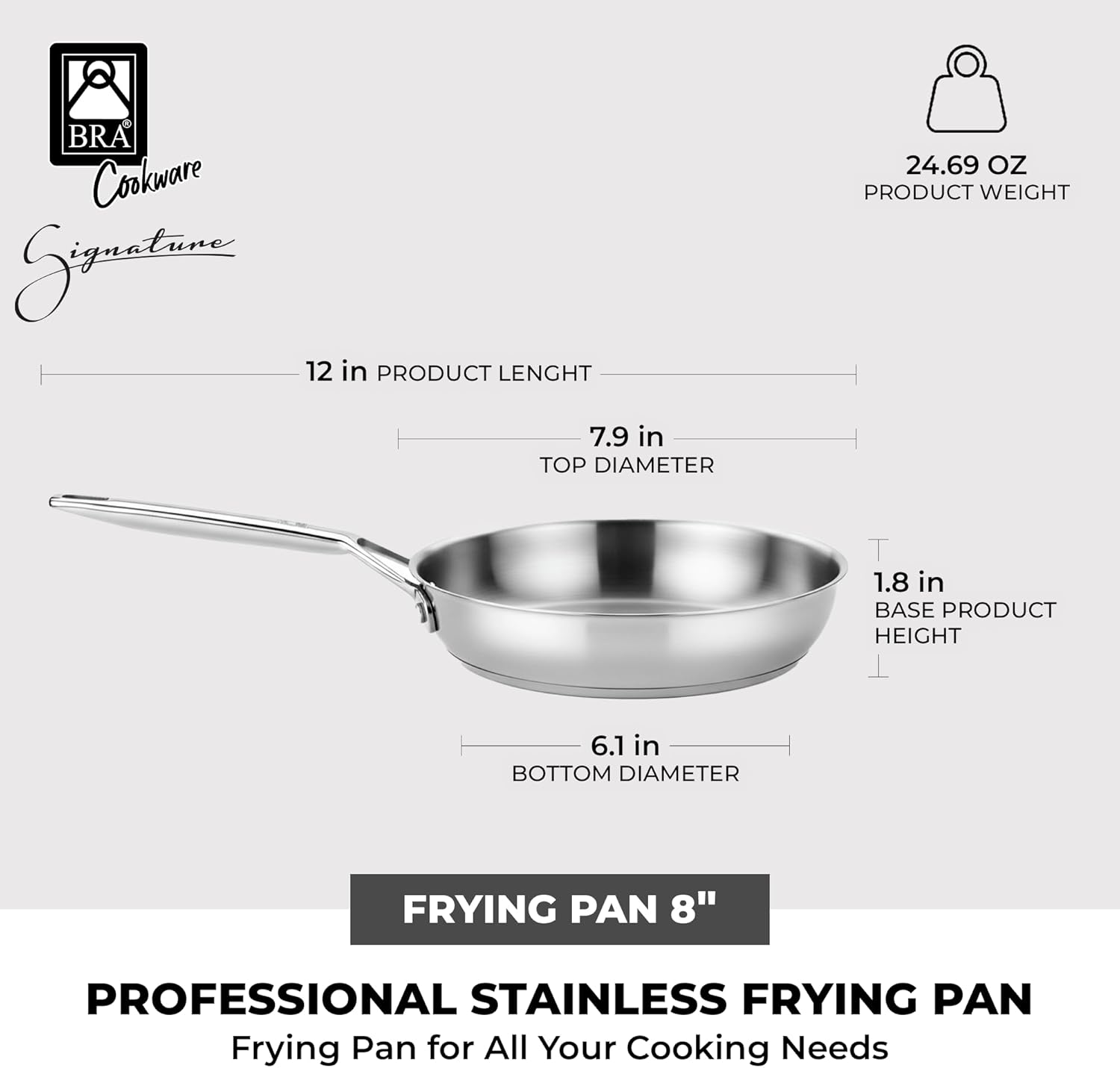 BRA COOKWARE Signature Frying Pan | 8 inches Professional Skillet | Stainless Steel Frypan | All Stovetop Compatible – Full Induction Skillet | PFOA Free | w/o Non-Stick Coating | Polished Finish