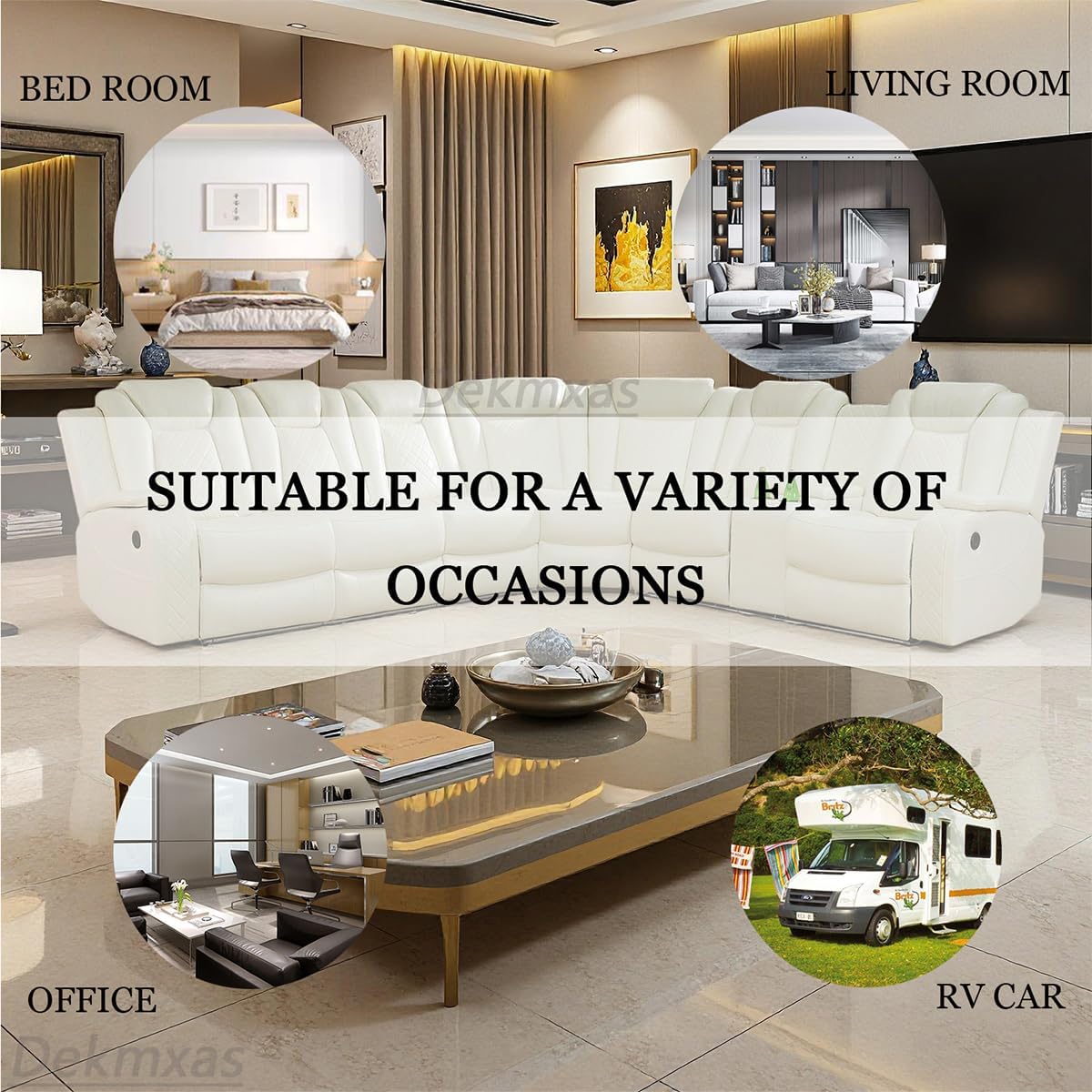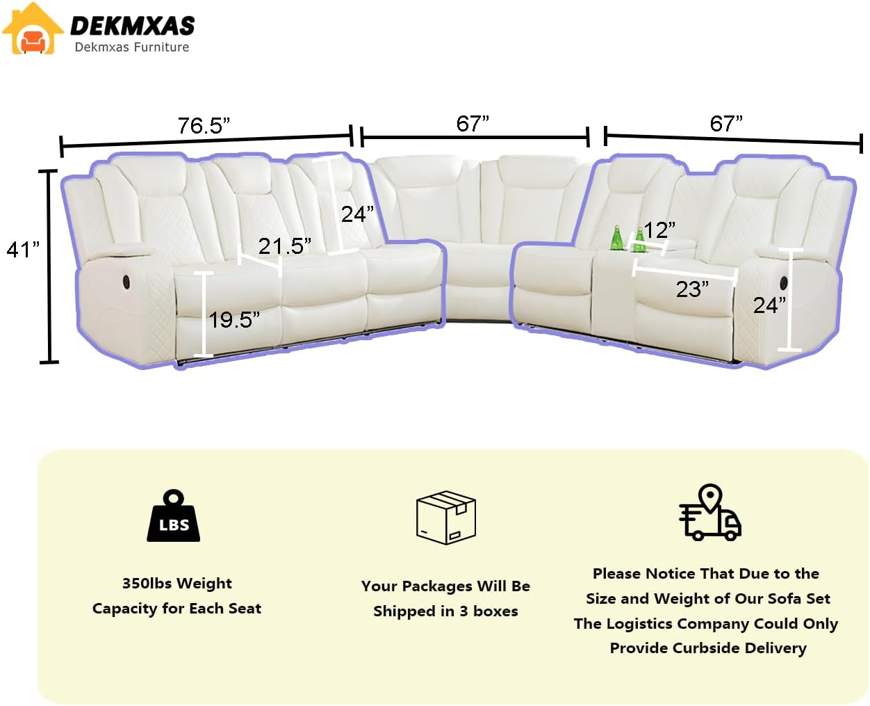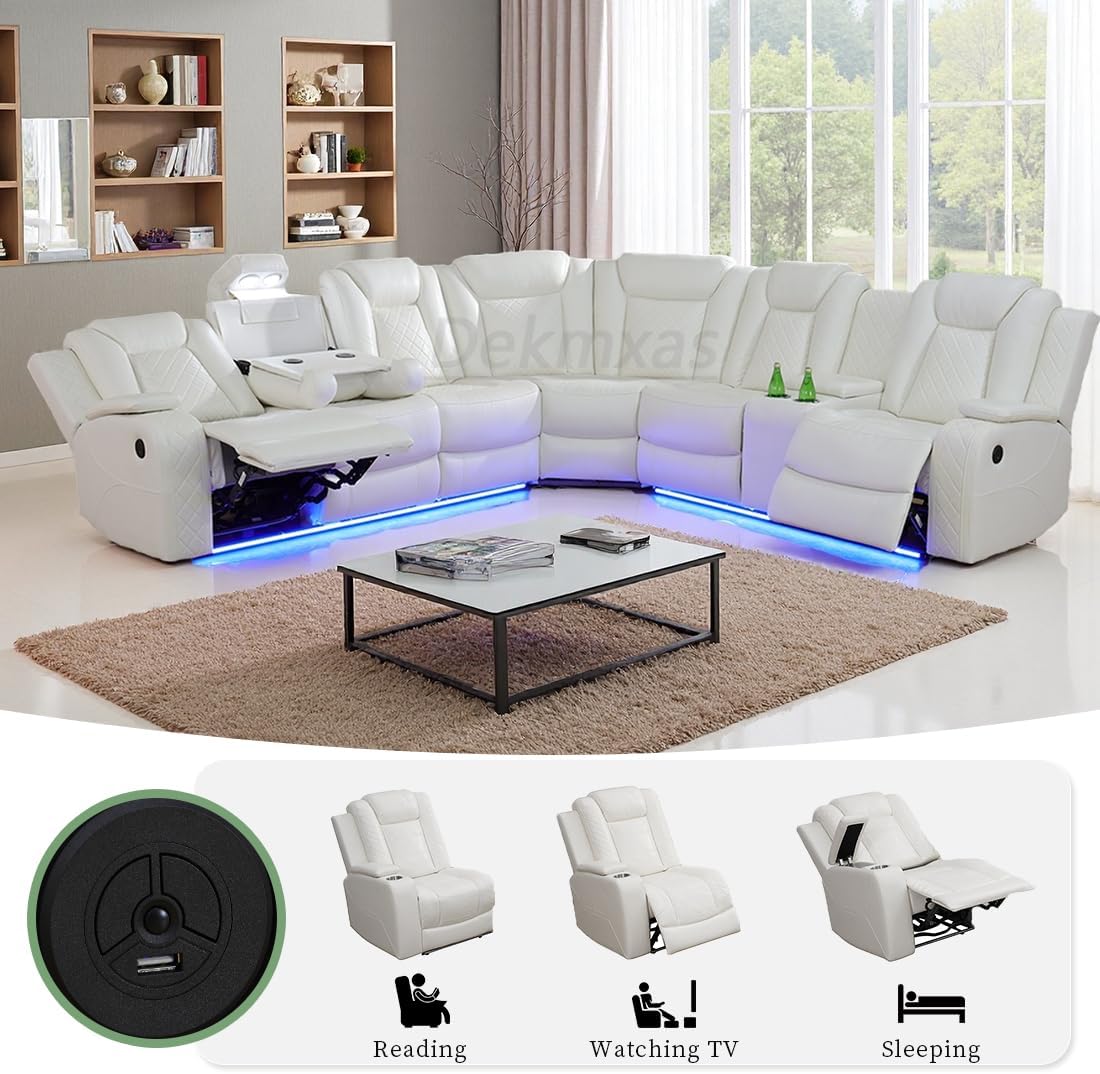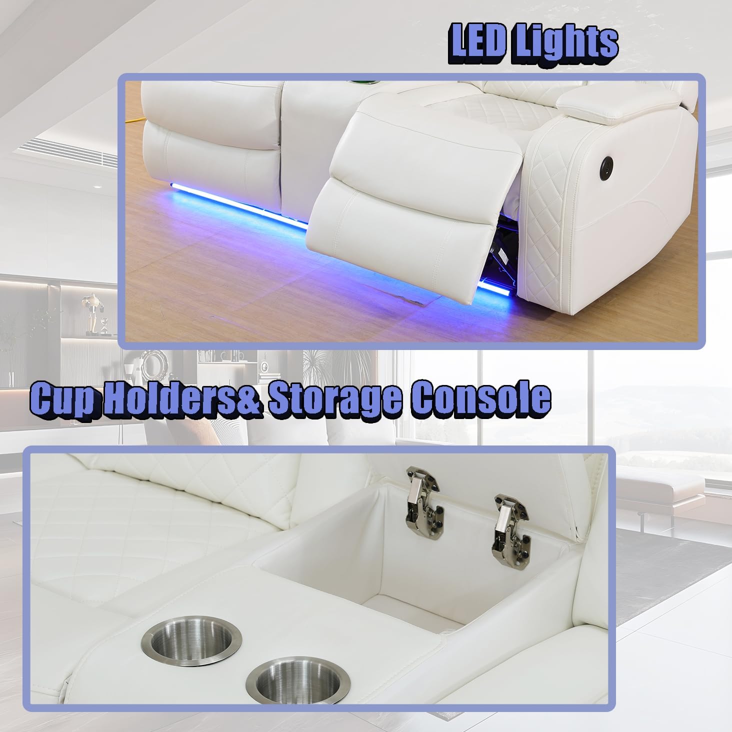 Breathing Leather Power Recliner Sectional Sofa Couch with LED Light, Living Room Furniture Sets,Creamy White Power Reclining Sectional Sofa Set with Storage Console/Cup Holder for Living Room