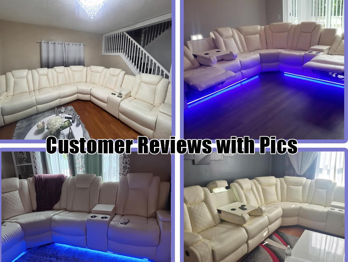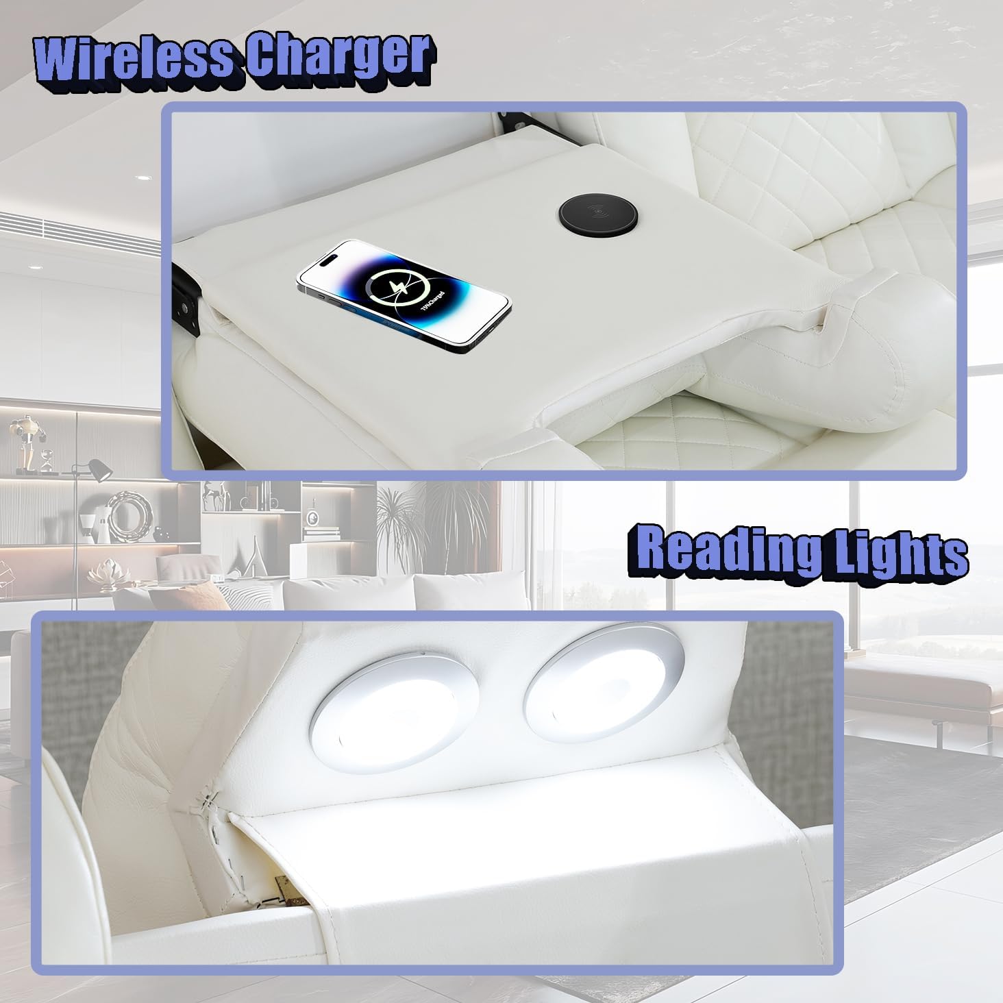 Multi-functional Features:The handrail is equipped with a storage function, allowing for the storage of daily small items. The loveseat has a storage compartment,the cup holder can hold beverages and cups. The Inductive charging pad on the drop-down table can charge your phone, which is flexible and convenient. In addition, it comes with a flip-up reading light,allowing you to enjoy the pleasure of reading in a low-light environment. The bottom of the sofa is equipped with an LED light.