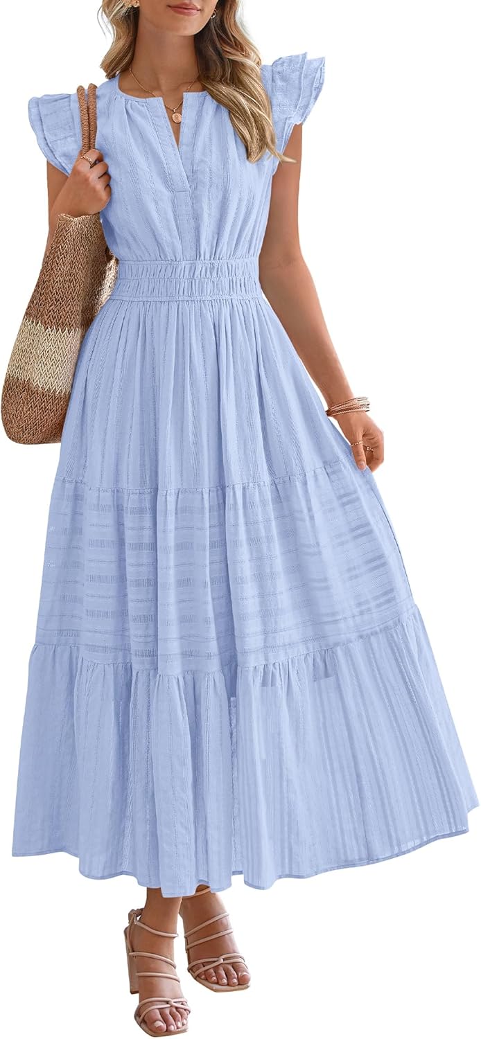 BTFBM V Neck Short Flutter Sleeve Boho Dress Maxi Dresses