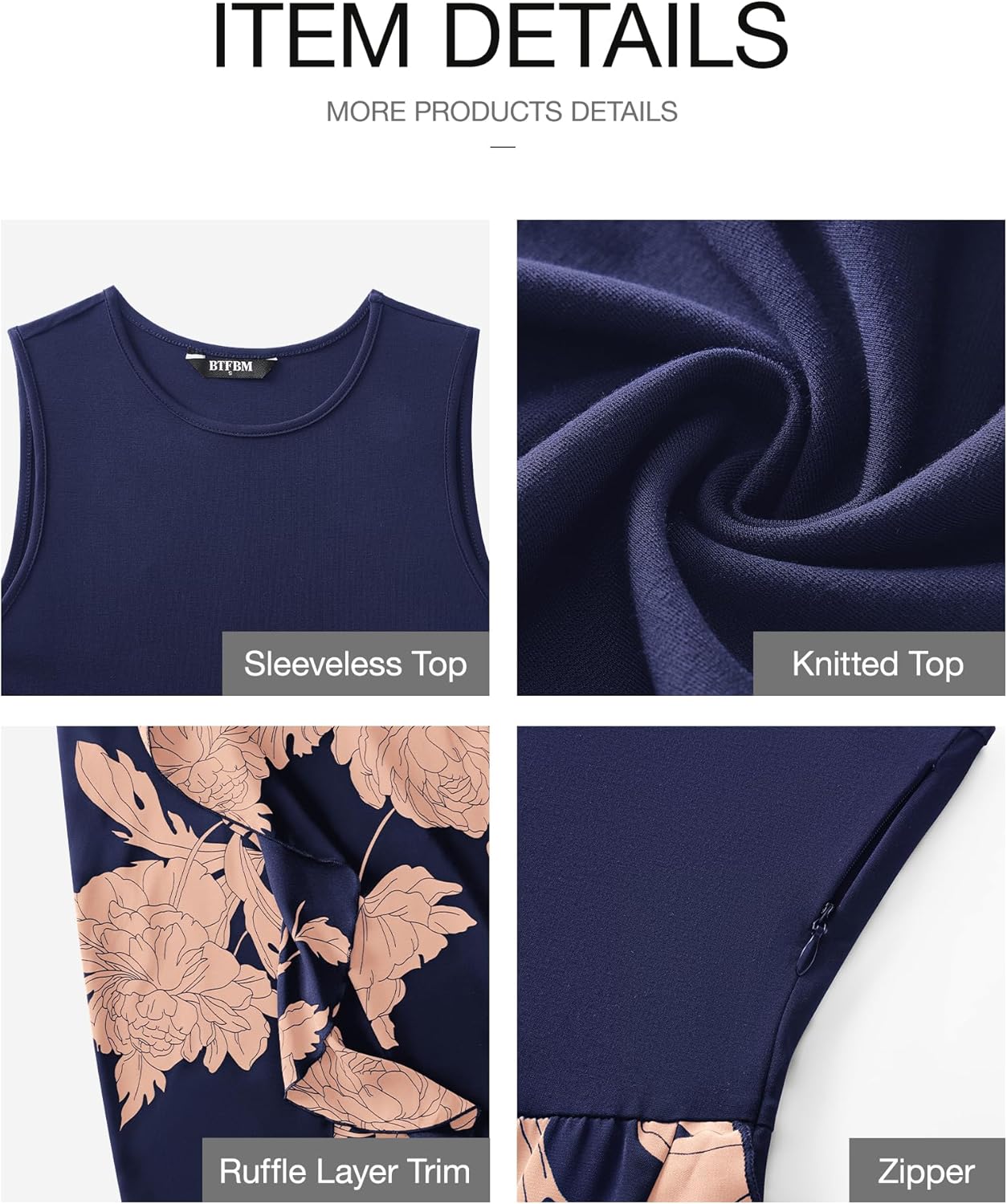 BTFBM Women Casual Sleeveless Summer Dresses 2026 Spring Crewneck Patchwork Boho Floral Ruffle Cocktail Party Midi Dress