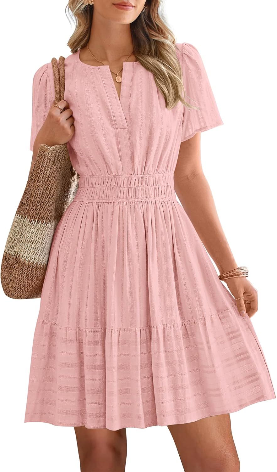 FEATURES: Boho Dress with V Neck and Elastic Waist is Designed with Small Hollow Out Adds An Extra Layer of Texture and Unique Touch
