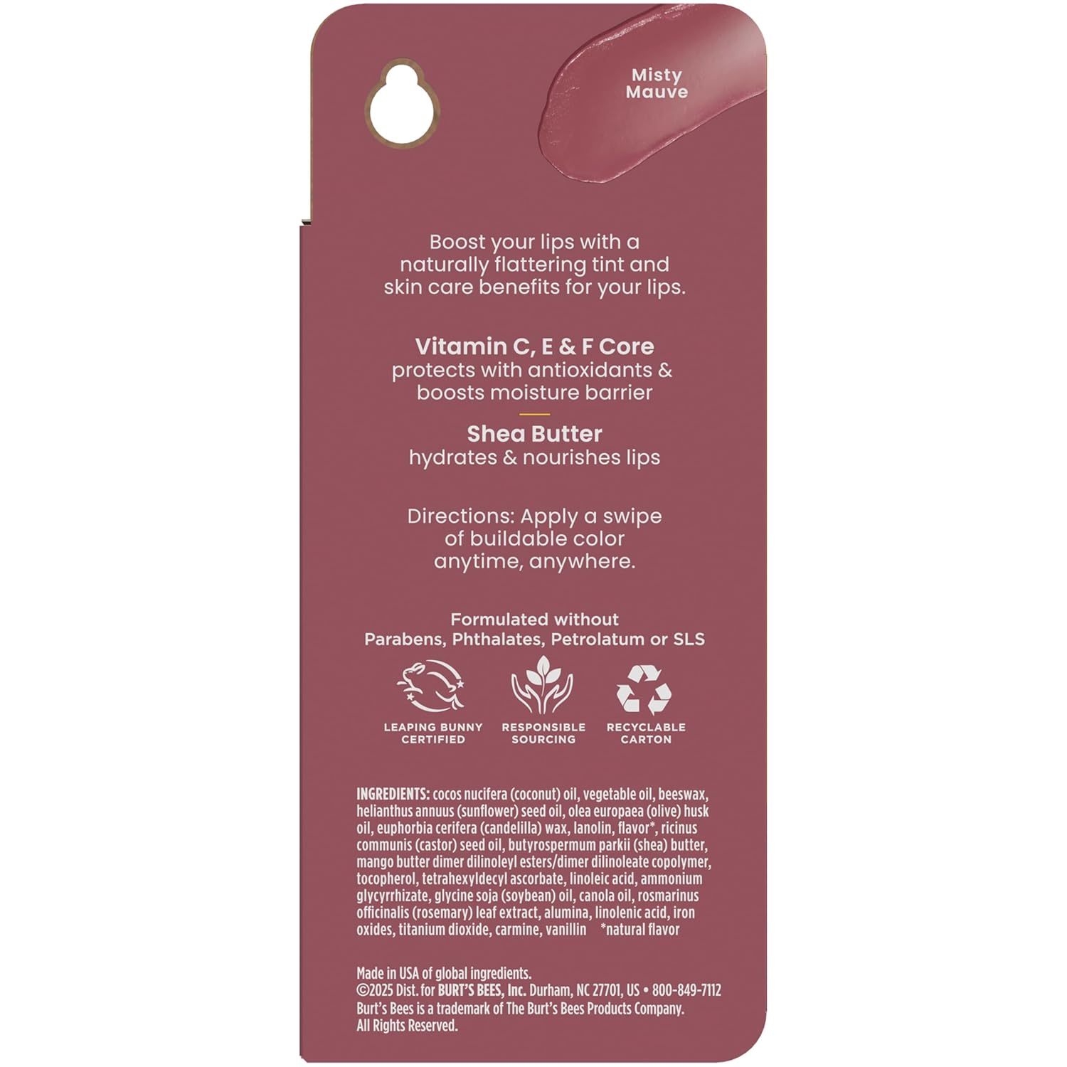 TINTED LIP BALM: One 0.16 oz. lip balm tube of Burt’s Bees Misty Mauve Tinted Boosted Lip Balm that nourishes and hydrates while flattering lips with the perfect hint of buildable color