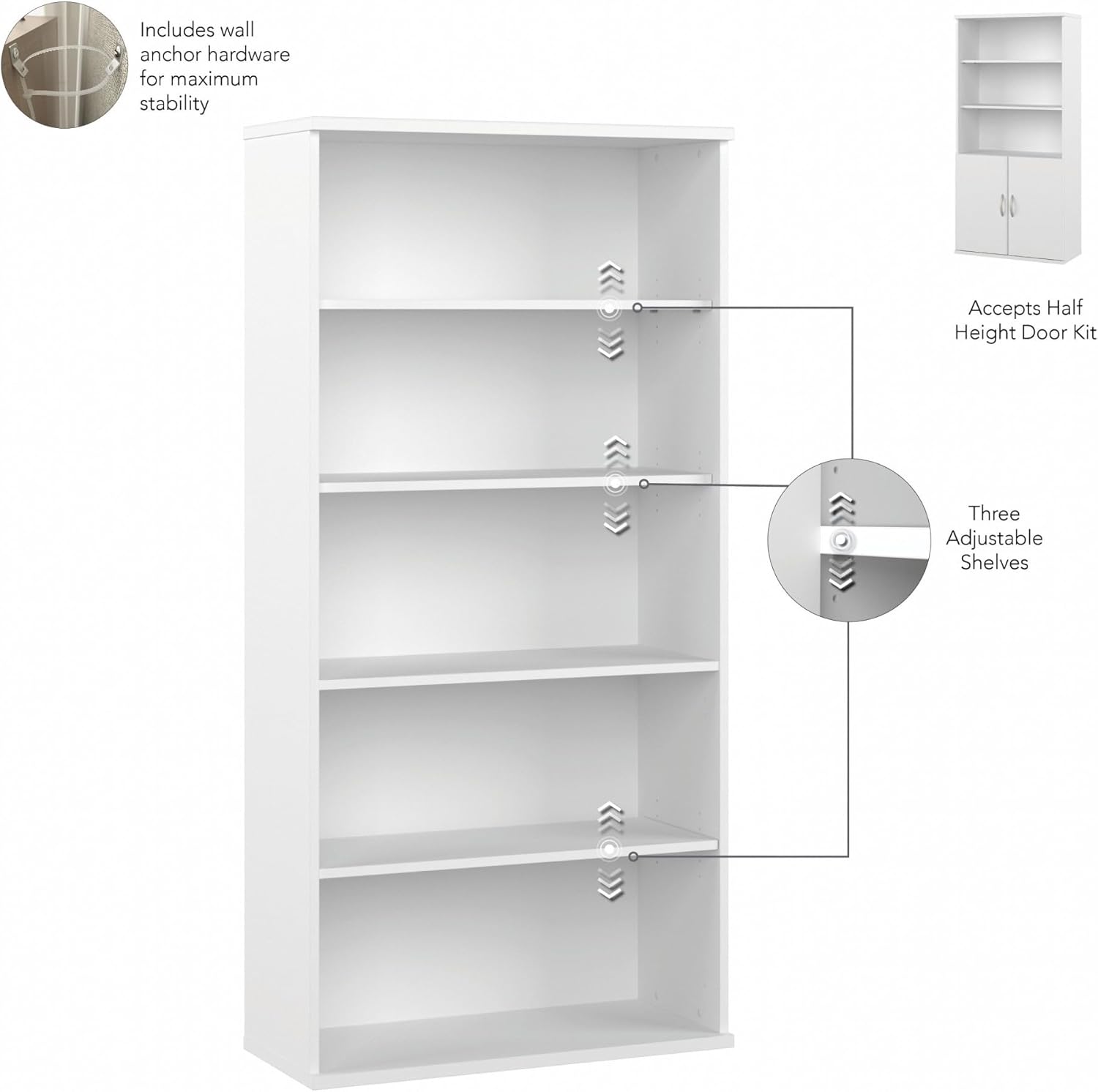 The Bush Business Furniture Studio C 5 Shelf Bookcase looks great, works hard and adjusts to fit the needs of your office. Designed with two fixed and three adjustable shelves, the tall Bookcase holds your books and reference materials with room for your favorite decorative accents. Store a variety of items on the spacious and durable shelves, designed to hold up to 50 pounds each. A thermally fused laminate finish fends off scratches, stains and dents throughout years of everyday use. Add the coordinating Bookcase Door Kit (sold separately) to conceal the lower shelves for an organized look. The 5 Shelf Bookcase features a classic design but comes in your choice of several contemporary and traditional finishes to fit perfectly in any workspace. Purchase a set of Bookcases to build a complete storage wall that organizes your office and expresses your style. This 5 tier bookshelf is backed by a 10 Year Manufacturer’s Warranty and meets ANSI/BIFMA quality test standards. See the full collection for coordinating items available to make your office your own with Studio C. American made with U.S. and imported parts.