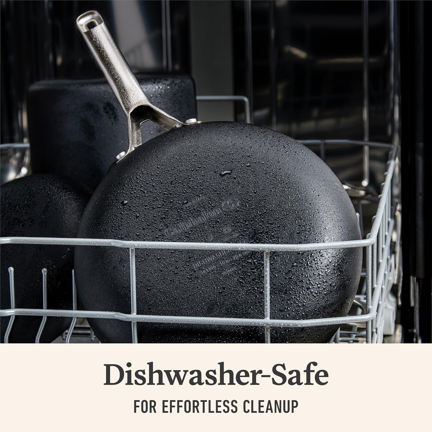 Thoughtfully crafted with durability and versatility in mind, this Calphalon® Hard-Anodized Nonstick sauté pan with lid elevates everyday cooking. Kitchen tested over 100,000 times, this sauté pan delivers superior cooking performance you can count on, every meal, every time. Experience cookware that brings more than food to the table, delivering even, oven-safe heating up to 450 degrees F, easy nonstick food release, and effortless dishwasher-safe cleanup. Designed to empower confidence in the kitchen, with lasting nonstick technology and a stainless steel handle that stays cool on the stovetop. A kitchen essential for every home chef, this cooking pot is ideal for everything from poaching fish, frying cutlets, making sauces, and more.