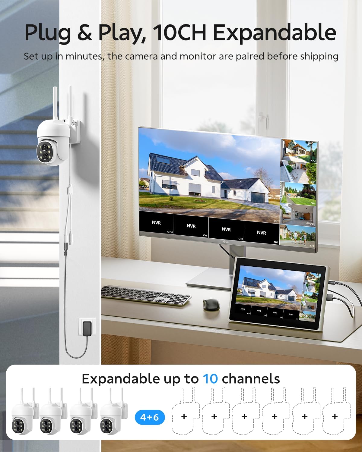 10CH NVR Security Camera System + 4K HD: Standard 10.1-inch touch screen display, supporting 4K ultra-high-definition picture quality display. The system can be extended to connect up to 10 cameras (standard 4 + optional 6), 500GB hard disk (upgradeable to 3TB) to support 30 days of cyclic video recording. H.265 compression technology saves 50% storage space. providing you with longer days of footage.