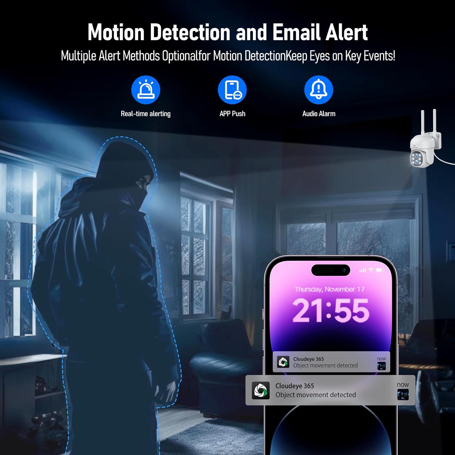 Spotlight & Siren Alarm: The Security Cameras Wireless Outdoor with a spotlight alarm and sound alarm function, when suspicious motion is detected at night, the security cameras wired outdoor will automatically turn on the powerful spotlights and siren alarm to help you deter intruders