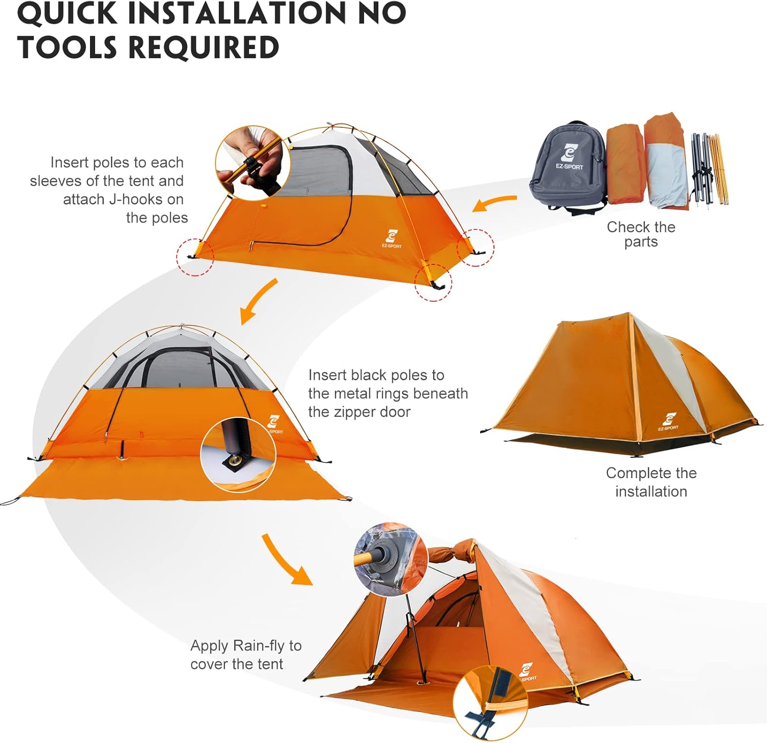 【Easy to Set-Up】 The tents for camping that can be quickly assembled within a few minutes and easily assembled by one person according to the procedures and instructions sewn inside the bag.