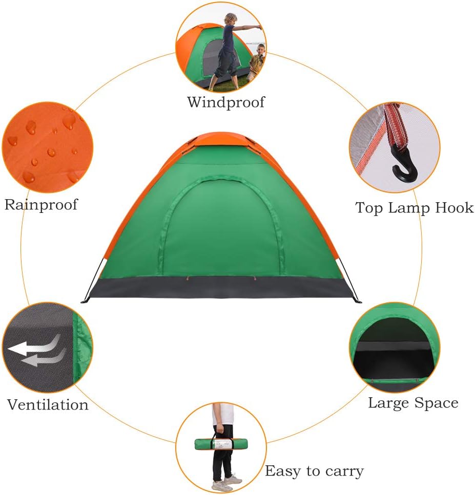 The camping tent is made of stronger tear-resistant polyester.It come with a removable rainfly and zippers designed for keeping the rain outside the tent. The ropes of tent and piles ensure safety and stability.