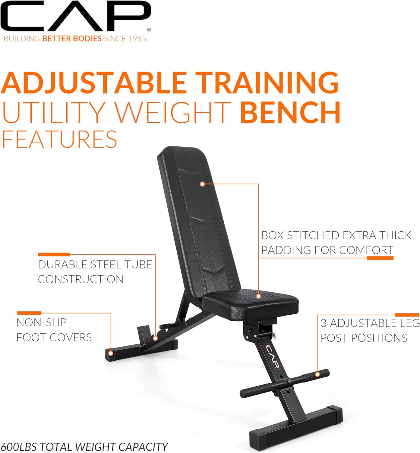 CAP Barbell Adjustable Training Utility Weight Bench | Foldable Multi-Position Incline/Flat Bench with 6 Backrest Settings, Thick Padding & 600 LB Capacity | Home Gym Workout Bench