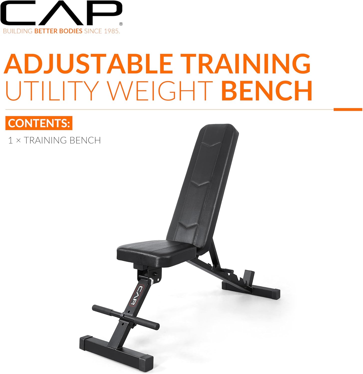 The CAP Barbell Adjustable Training Utility Weight Bench is built for strength training, versatility, and compact home-gym use. This premium bench features 6 adjustable backrest positions for incline, flat, and near-upright workouts, plus a space-saving fold-up design for easy storage under a bed, in a closet, or against a wall. The extra-thick, box-stitched padding provides durable comfort, while the steel-tube frame and non-slip foot covers add long-lasting stability.Designed for dumbbell training, chest presses, shoulder workouts, core exercises, and total-body routines, this bench supports up to 600 LB total weight capacity. Compact, durable, and adjustable, it’s the ideal utility bench for any home gym or limited-space workout area.