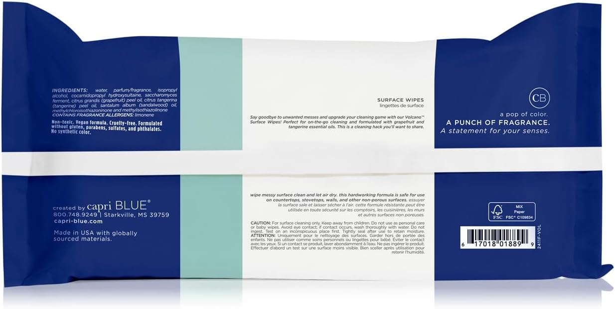 Capri Blue Volcano Multi Surface Wipes (48 ct): Say goodbye to unwanted messes and upgrade your cleaning game with our Volcano multi surface cleaner wipes! Perfect for at home and on-the-go cleaning, easily stash away in your bag and be the MVP of your brunch crew. Fragranced with our iconic Volcano scent and formulated with grapefruit and tangerine essential oils, this is a cleaning hack you’ll want to share. — Capri Blue Home Care: Put some pep back into your cleaning step with these all-purpose cleaning wipes! Fragranced with our iconic Volcano scent and formulated with grapefruit and tangerine essential oils, this is a cleaning hack you’ll want to share. Formulated without gluten, parabens, sulfates, and phthalates. No synthetic colors. — How To Use: Wipe messy surface clean and let air dry. This hardworking formula is safe for use on countertops, stovetops, walls, and other non-porous surfaces. — About Us: Capri Blue is an intersection where fashion meets fragrance. Inspired by contemporary fashion trends, Capri Blue creates exciting new home fragrance products for every season.