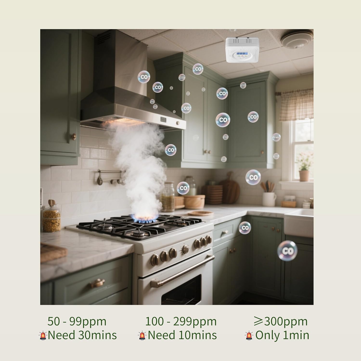 【Real-Time Monitoring with Clear Digital Display】Features a bright digital screen that constantly shows ambient CO levels (0ppm when safe). Unlike detectors with hidden status lights, this real-time display confirms active operation and air quality at a glance. Track subtle changes in ppm to address risks early, before alarms trigger.