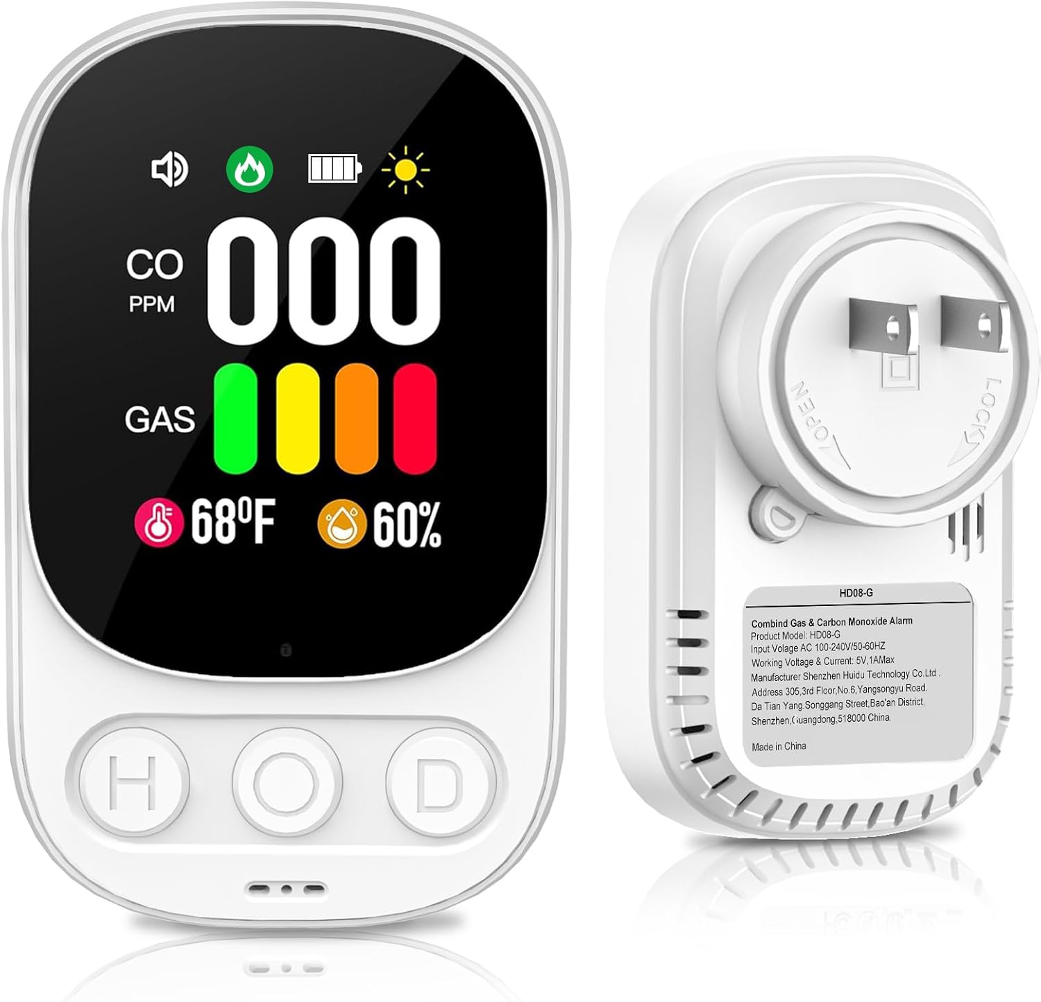Carbon Monoxide Detectors Plug in & Natural Gas Leak Detector, 4-in-1 Portable Carbon Monoxide Alarm Propane Gas Detector, Temp Humidity, HD Screen CO Detector for Travel Home Hotel Camping RV (White)