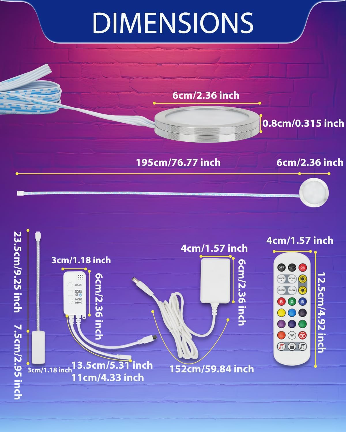 💡 Premium Build, Long-Lasting Performance : – Aluminum alloy body + frosted PC cover ensures even, glare-free light and superior heat dissipation. Energy-efficient LEDs last up to 50,000 hours—safe, cool, and reliable. Your purchase includes (6)RGB puck lights,(1)12V 1A Power adapter, (1) splitter, (1)IR Remote (1)Control box receiver.
