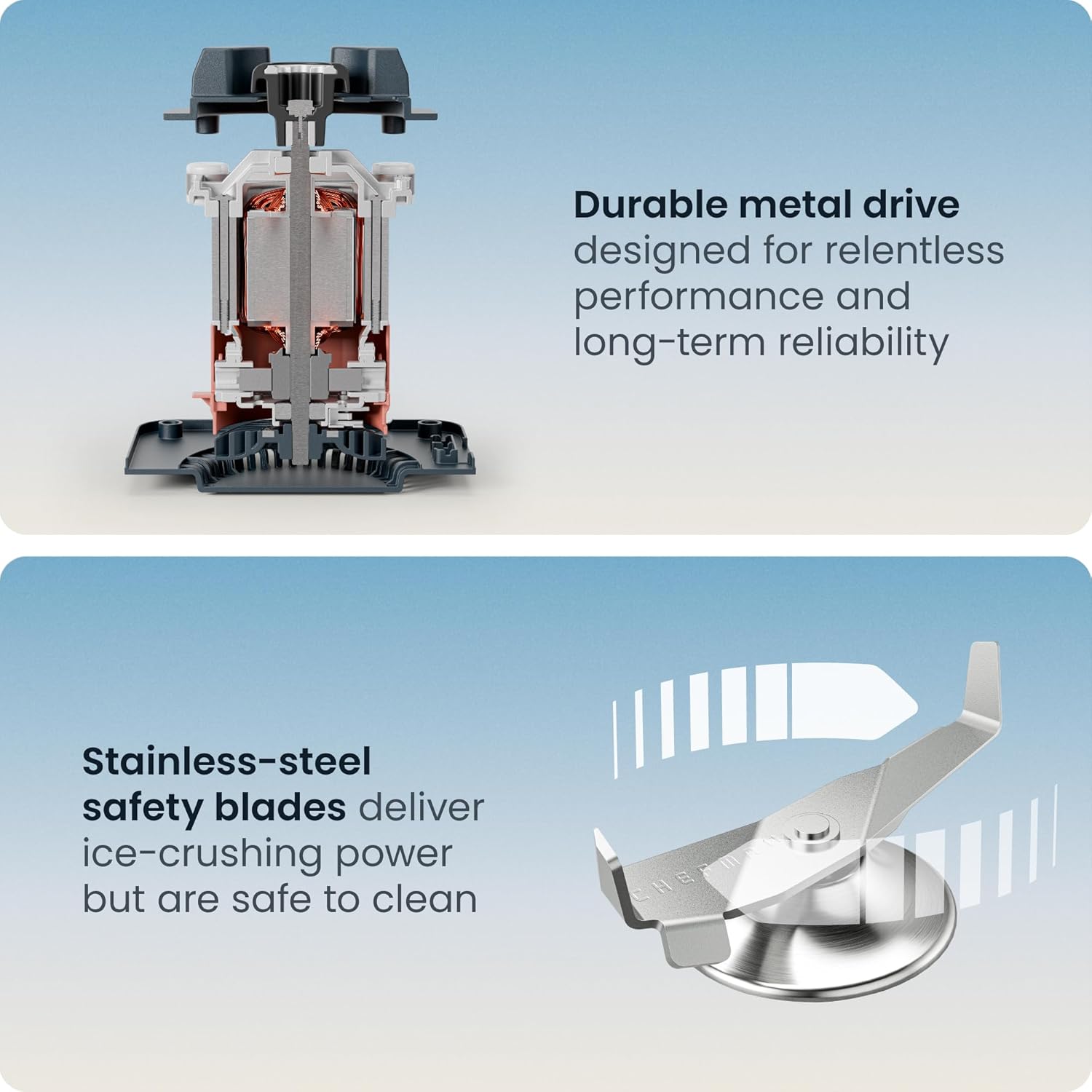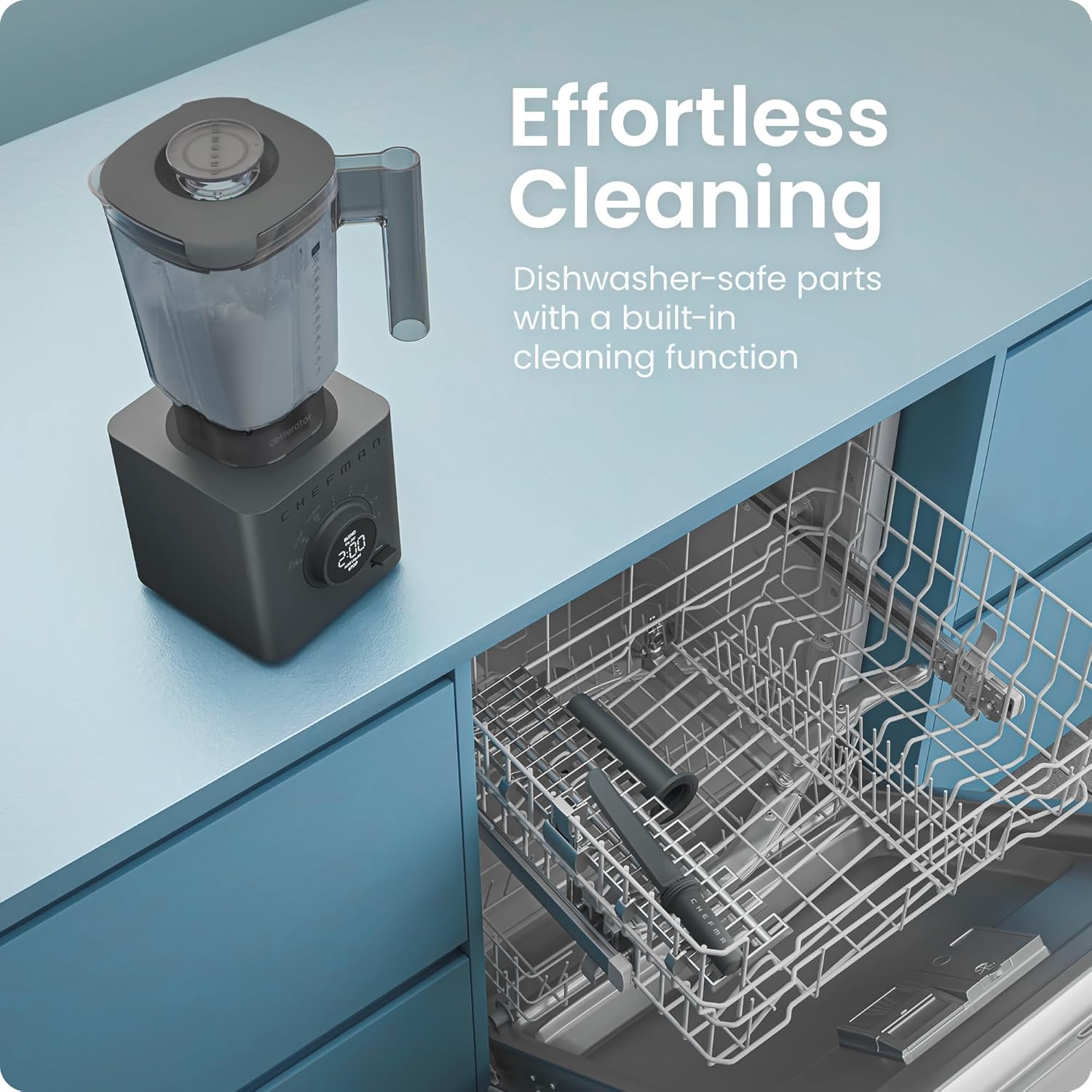 TWO WAYS TO CLEAN: Keeping this blender for kitchen clean is a breeze. Either run the “Clean” preset with soap and water or throw the accessories directly into the dishwasher and avoid any hassle. The innovative blunt-blade design ensures safety while cleaning without sacrificing performance.