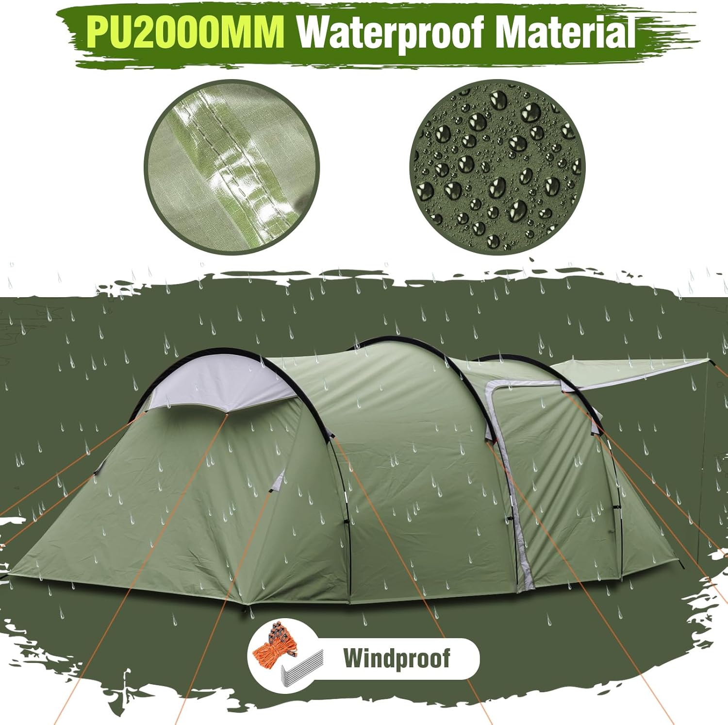 Stability and Packability: Supported by sturdy fiberglass poles and equipped with numerous aluminum stakes and wind ropes, the tunnel tent offers exceptional stability, capable of withstanding strong winds and adverse weather conditions without compromising its structural integrity.Can be compactly packed and stowed away, taking up less space in your camp cart or vehicle.They provide a comfortable and reliable shelter during multi-day trips in the wilderness.