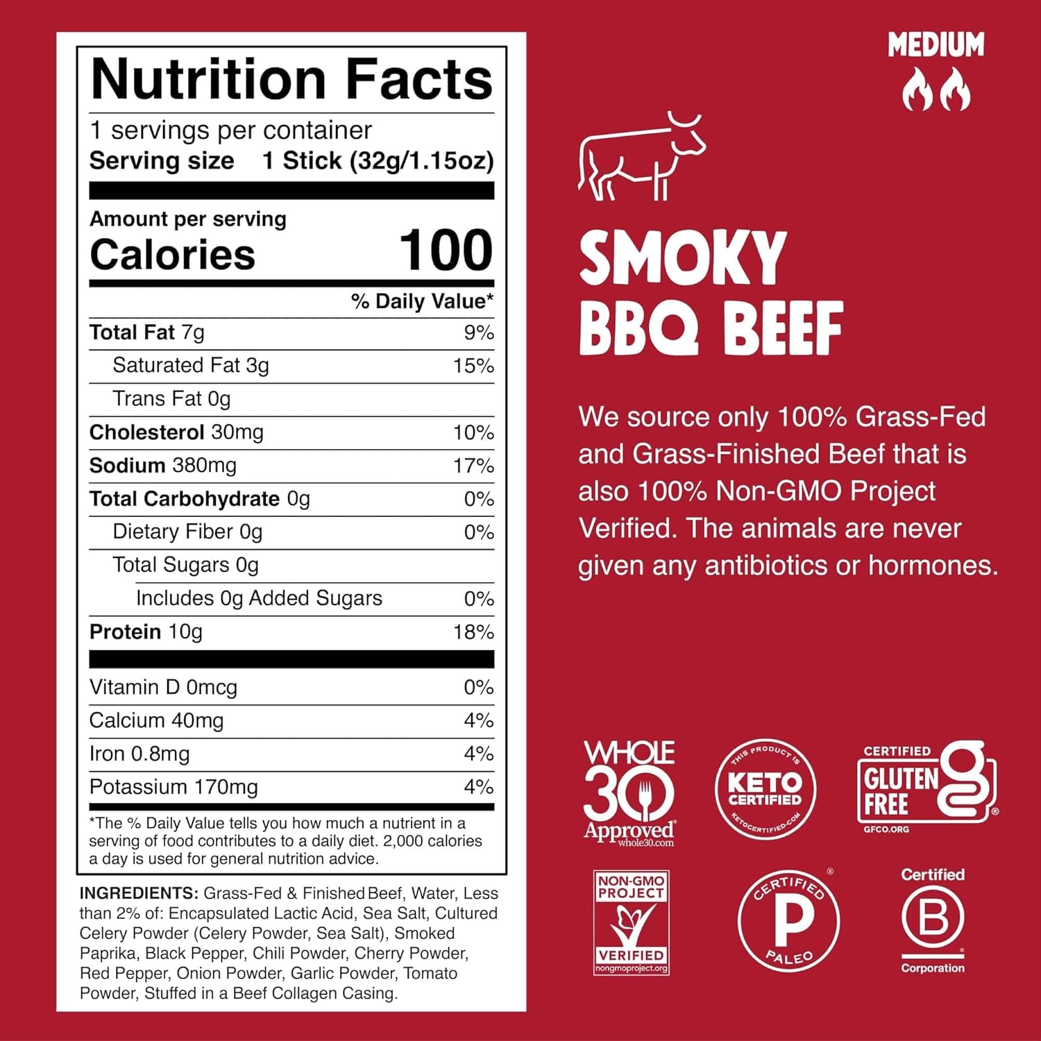 Total Snackage: Each satisfying 1.15 oz Smoky BBQ Seasoned Beef Jerky snack stick is made with high quality, real ingredients, has 10 grams of protein, zero sugar, and just 100 calories. The perfect snack you can feel good about anytime, anywhere.