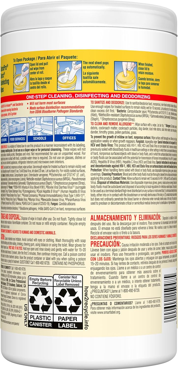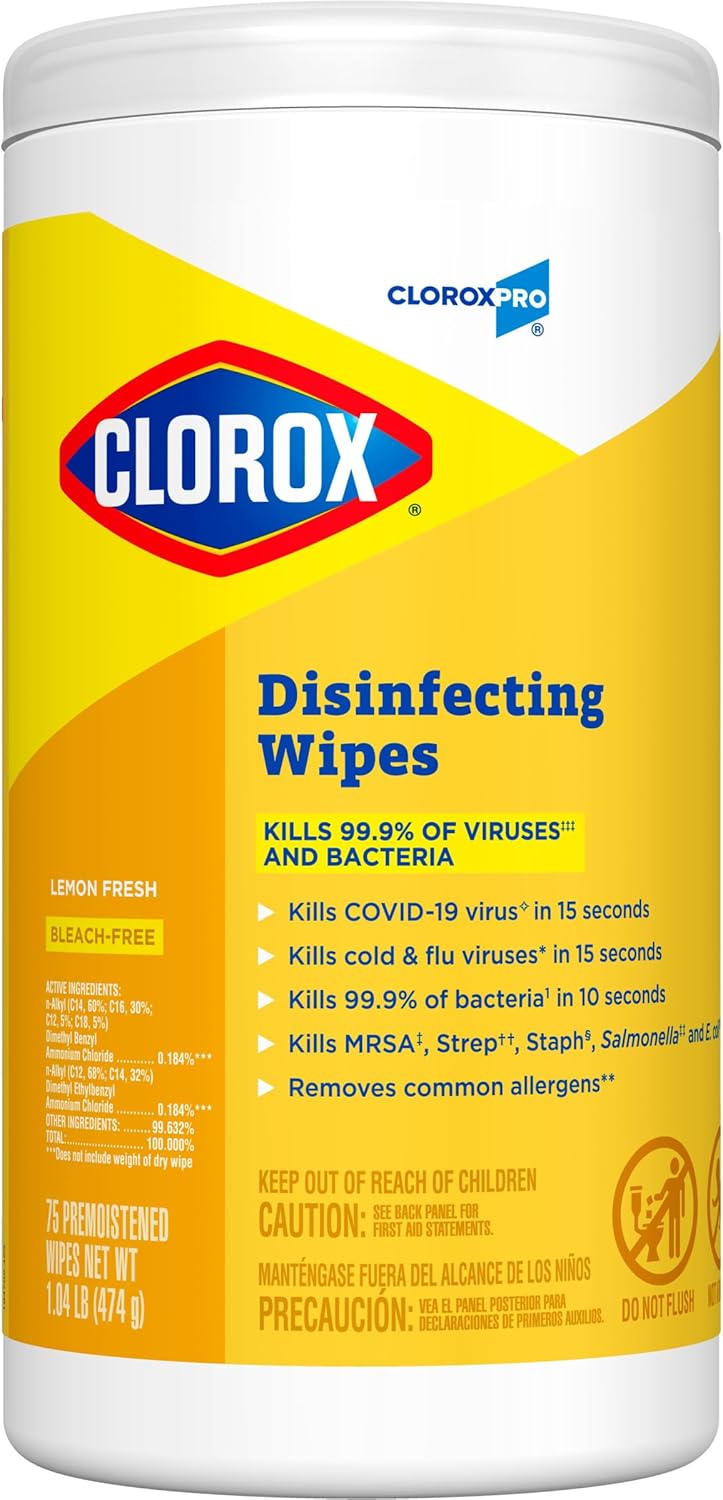 Clorox Disinfecting Wipes clean and disinfect in one easy step*. These lemon scented wipes are EPA-registered to kill 99.9% of germs including cold and flu viruses* in 15 seconds. They also remove common allergens like pet dander, pollen particles and grass. One antibacterial wipe can kill 99.9% of bacteria** in just 10 seconds. In addition, these wipes meet EPA criteria for use against SARS-CoV-2, the virus that causes COVID-19, on hard nonporous surfaces. The premoistened, textured wipes are suitable for a variety of surfaces including acrylic, glass and vinyl. Use on germ hot spots such as doorknobs, handrails and faucets. Ideal for offices, daycares, schools, hotels, restaurants and more. *When used according to disinfection directions. **Bacteria: Campylobacter jejuni, Escherichia coli O157:H7 (E. coli), Klebsiella pneumoniae (Kleb), Methicillin-resistant Staphylococcus aureus (MRSA), Salmonella enterica (Salmonella), Staphylococcus aureus (Staph), Streptococcus pyogenes (Strep).