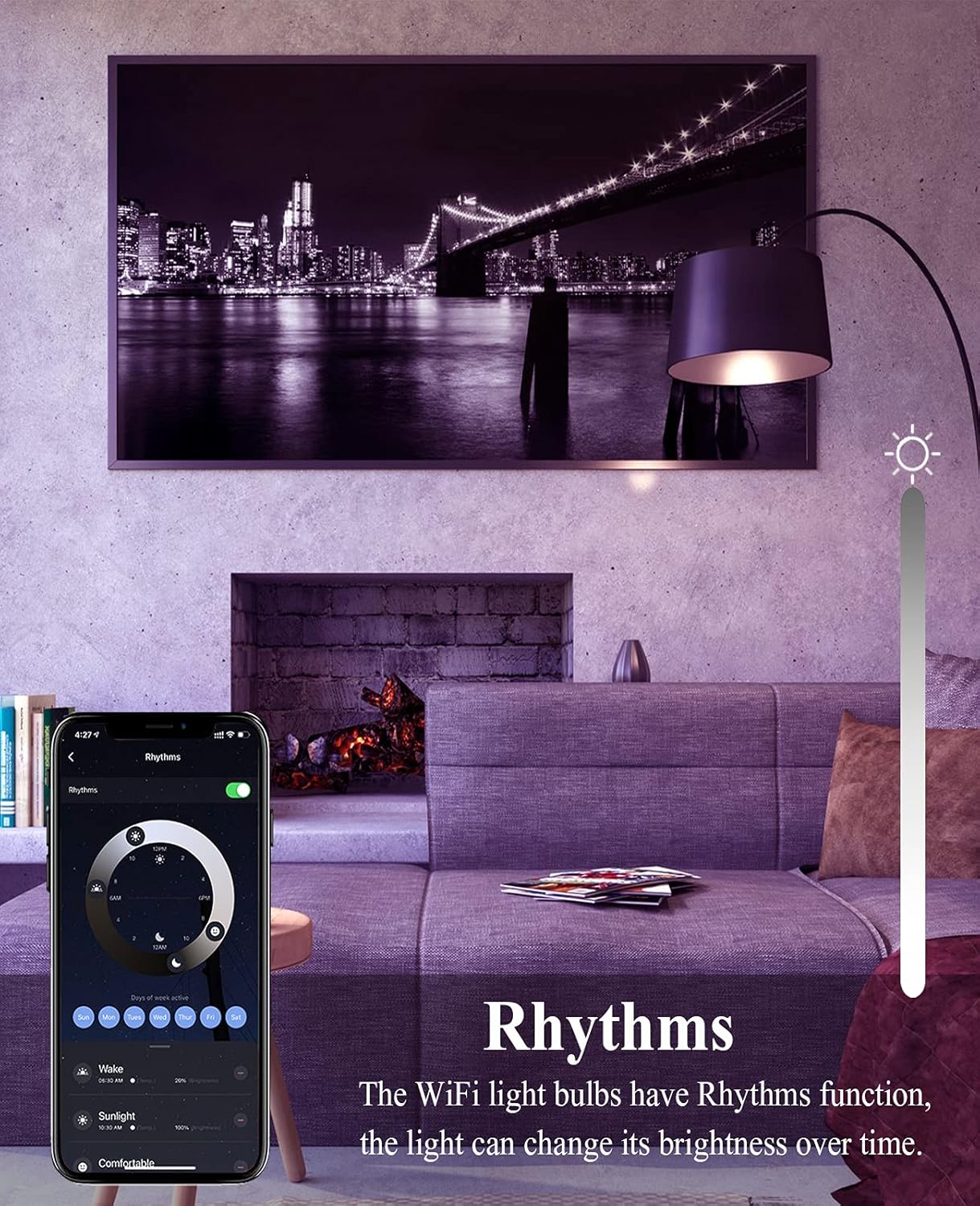 ♦Rhythms & Wake Up: Our e12 WiFi light bulbs have Rhythms function, the light can change its brightness over time. You can also set a Wake Up Plan and Sleep Plan, let the lights turn on or off at the time you set