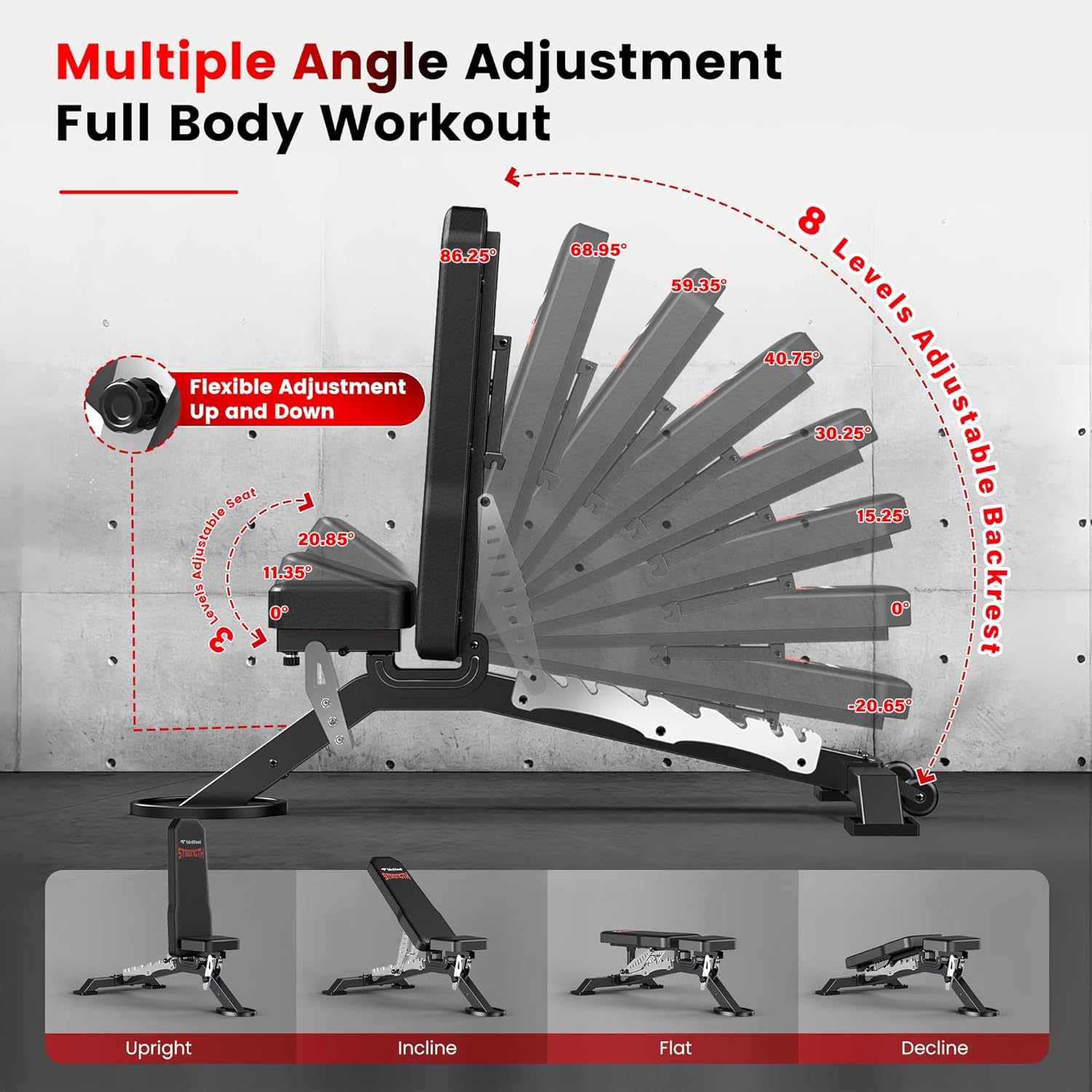 【Quick Multi-Angle Adjustments】This adjustable workout bench allows you to set the front seat in 3 positions and the backrest in 8 angles—from decline to upright. Designed as a versatile weight bench, the C-lock system ensures fast, precise, and stable angle changes, helping you target every muscle group with perfect form.