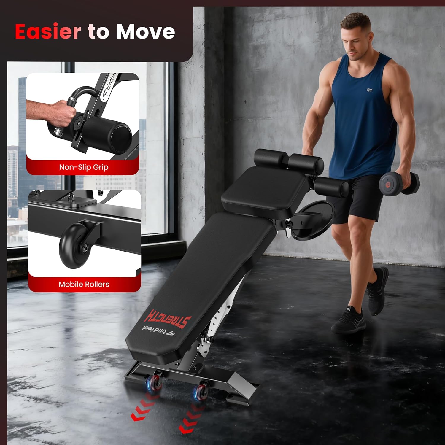 【Easy Setup & Smooth Mobility】This heavy duty weight bench comes 90% pre-assembled with clear instructions and a step-by-step video guide. The workout bench built-in transport wheels and a convenient handle make it effortless to move around your gym space.