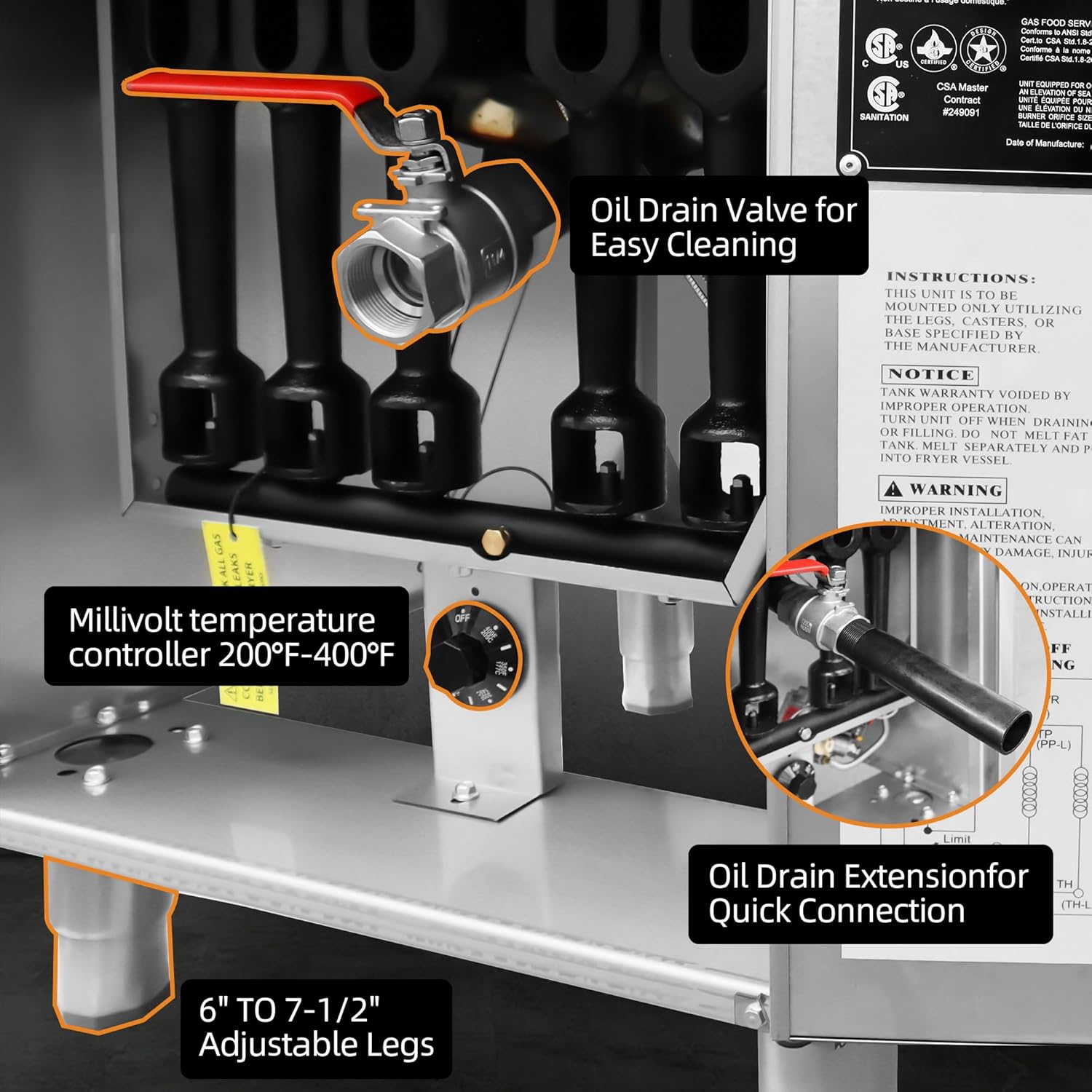 Industrial-Grade Durability Meets Smart Design: Constructed with 430 stainless steel, CSA design certified, NSF listed the fryer’s seamless interior and reinforced weld points resist grease buildup and corrosion. The 4-tube burner system distributes heat evenly across the cooking surface. Integrated flame failure protection and automatic 450°F shutoff exceed commercial kitchen safety standards