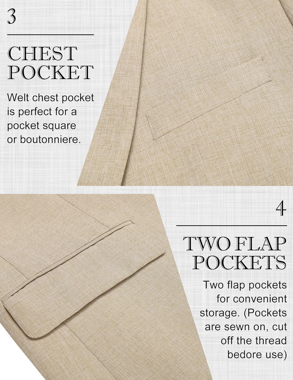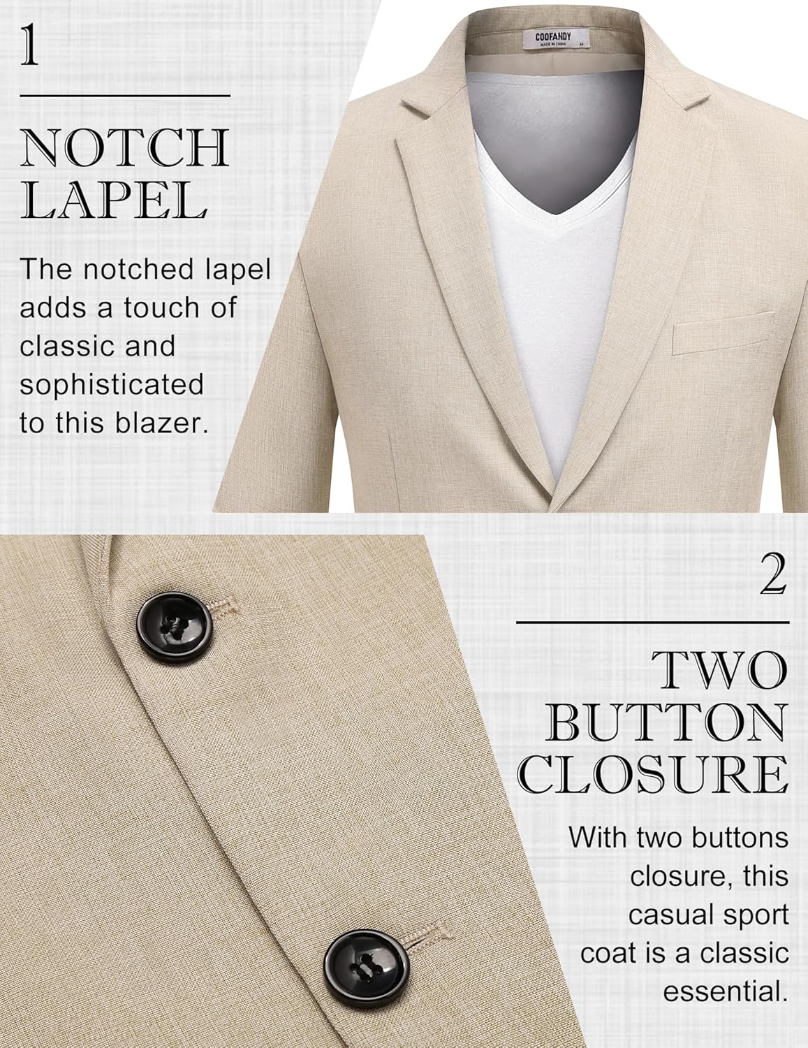 Most colors are textured except for the color “Solid Blazer – Black”. Linen-look texture creates a stylish and casual look, while the solid color is more classic and versatile.