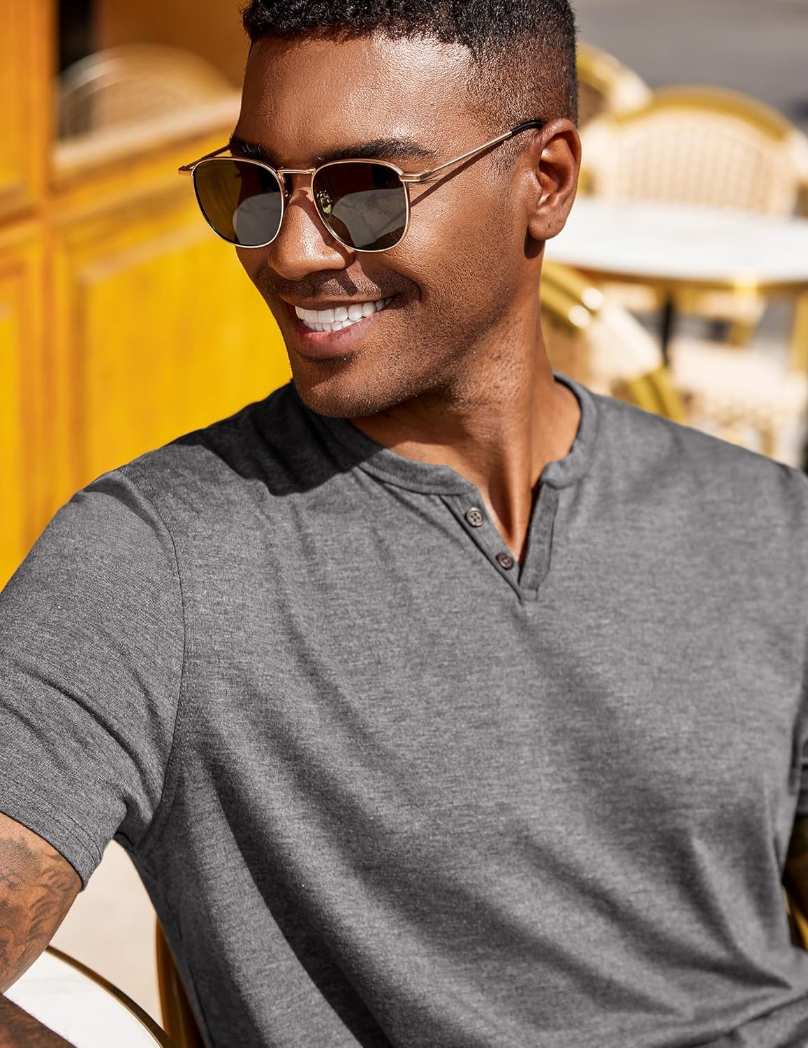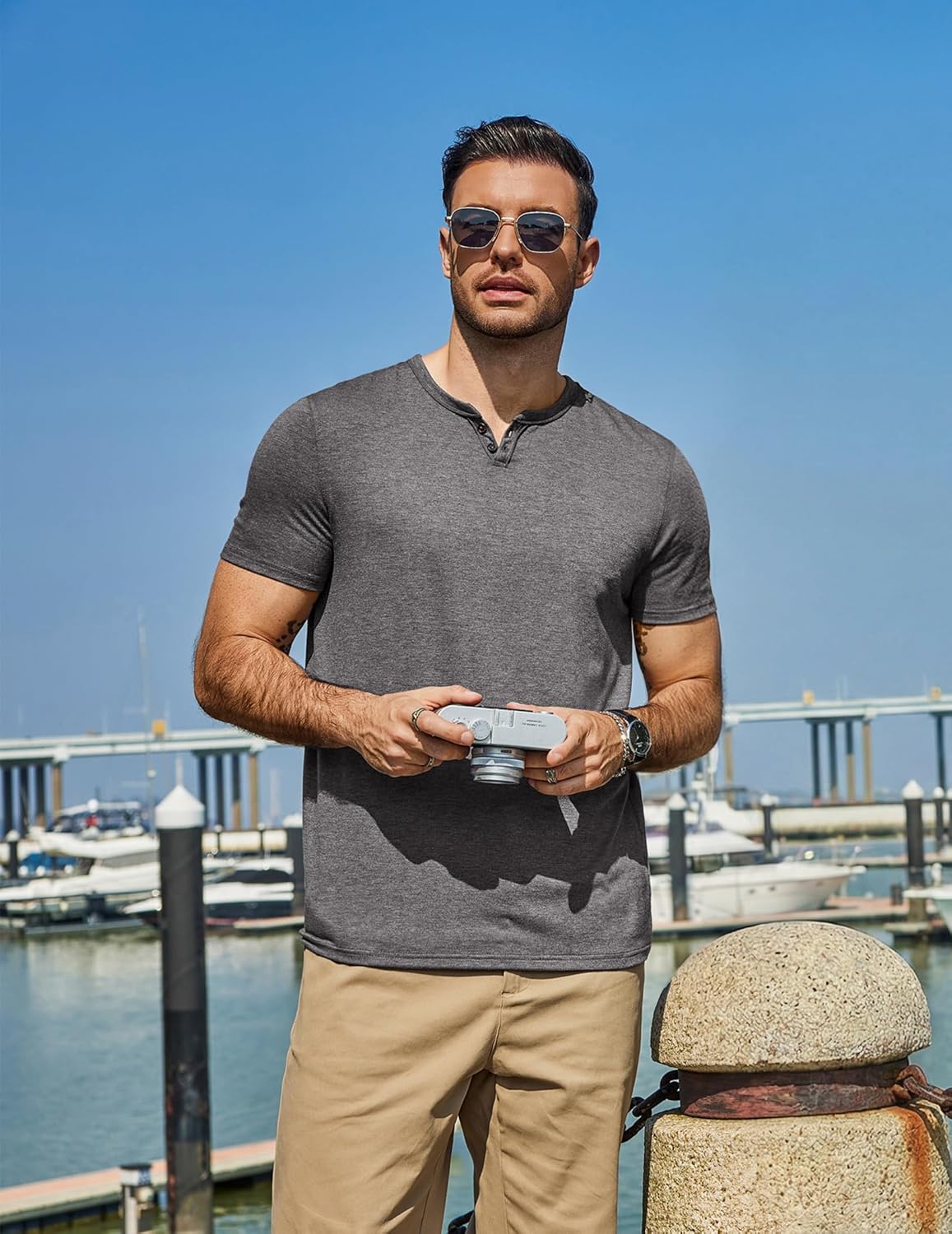 This double-button henley shirt is perfect for everyday wear and can be styled casually with family and friends.
