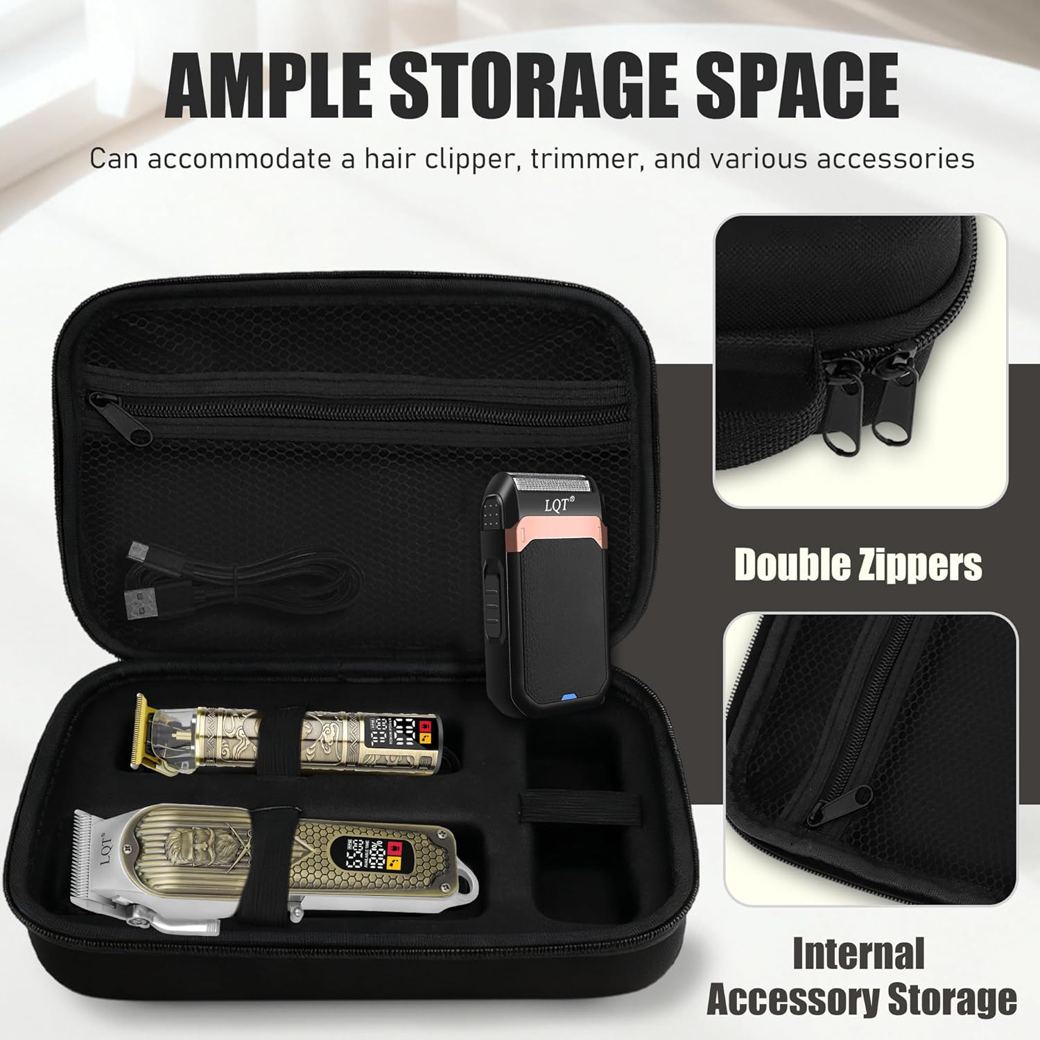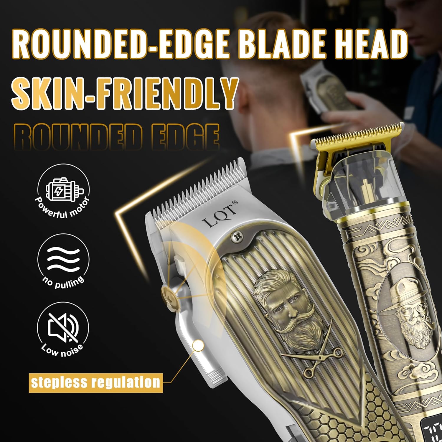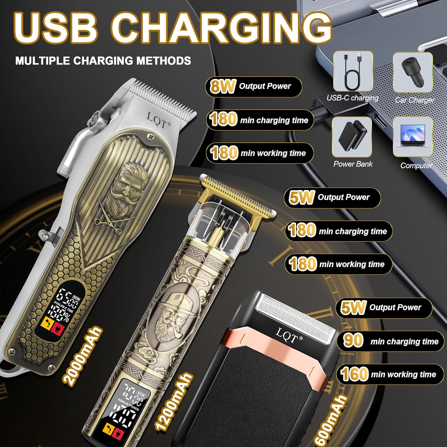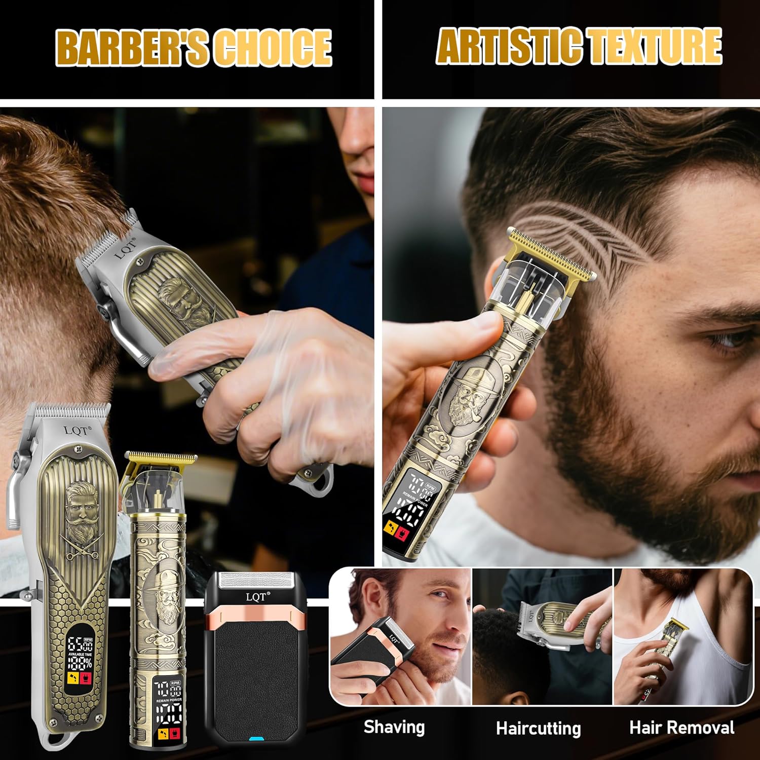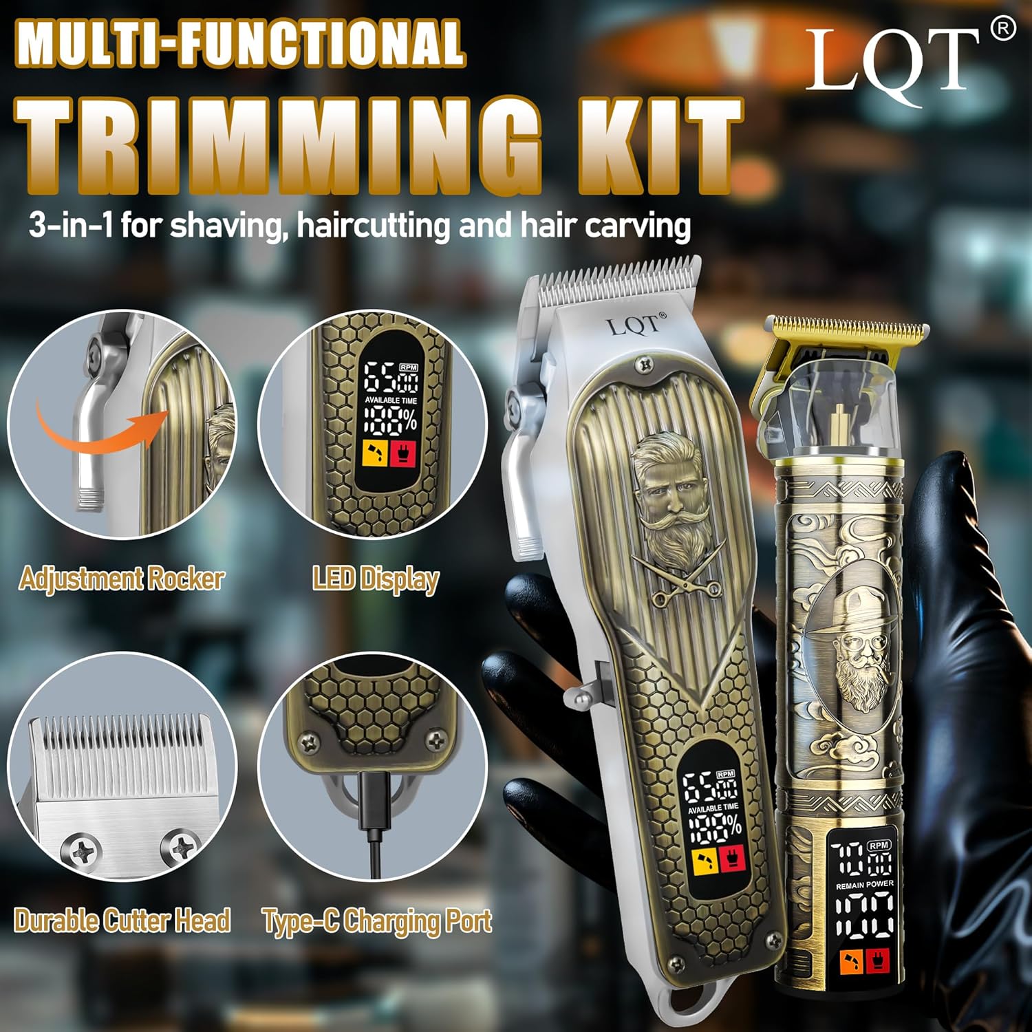 【Complete Vintage Barber Kit for Men】The LQT Bronze 3-in-1 Hair Clipper Kit includes a high-performance clipper, a detailed trimmer, and a foil shaver, each tailored for precision haircuts, beard trimming, and clean shaving, offering everything you need for a complete haircut and grooming routine. With 4 clipper combs, 3 trimmer combs, cleaning brush, cape, and USB cables, it’s a complete set for barbers and at-home use alike.this full professional barber set is perfect for fades, edging, and beard shaping at home or in the salon.