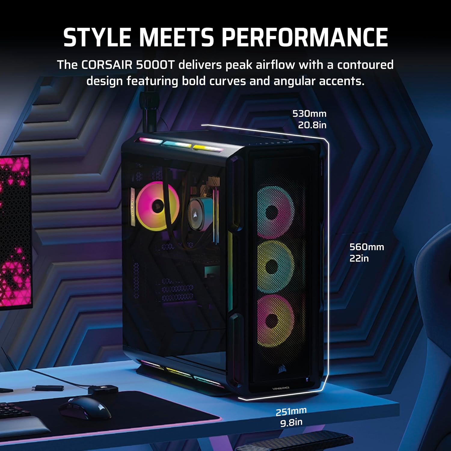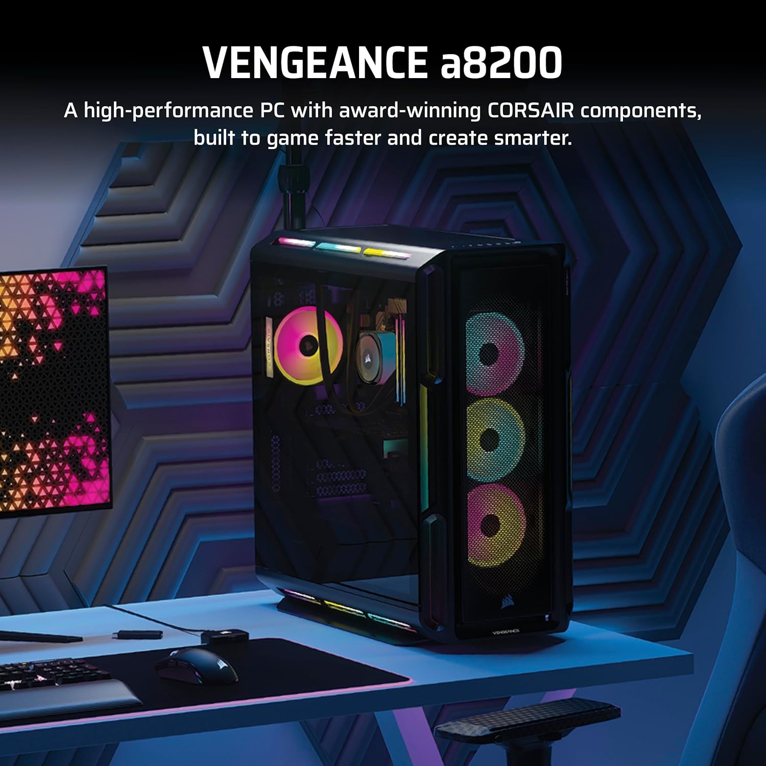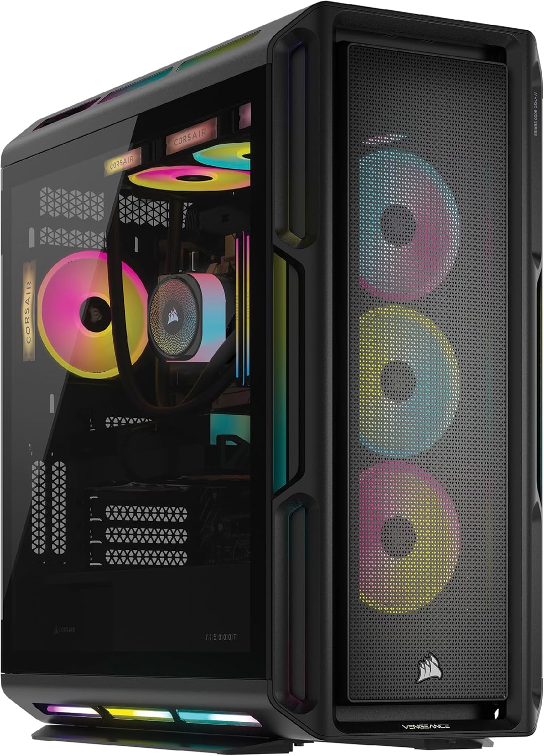 Step up your game with a CORSAIR VENGEANCE a8200 Series Gaming PC, powered by an AMD Ryzen™ 9000 Series CPU, GeForce RTX™ 50 Series graphics, and CORSAIR DOMINATOR TITANIUM RGB DDR5 Memory. Dynamic RGB lighting brilliantly illuminates the system, with powerful CORSAIR iCUE software to control lighting, fan and pump speeds, and more. The VENGEANCE a8200 Series is cooled by an iCUE LINK TITAN 240 RX RGB Liquid CPU Cooler and seven iCUE Link RGB fans for concentrated airflow. Equipped with a high-speed M.2 NVMe SSD, housed in a roomy CORSAIR 5000T mid-tower ATX case, and easily upgradeable thanks to a standard ATX form-factor, this is everything you need to game with a VENGEANCE. Technical Specifications: Dimensions (L x W x H): 530mm x 251mm x 560mm / 20.9″ x 9.9″ x 22.1″ CPU: AMD Ryzen™ 7 9800X3D GPU: NVIDIA® GeForce RTX 5090 graphics DRAM: 64GB CORSAIR DOMINATOR TITANIUM RGB DDR5 6400MT/s memory Primary Storage(SSD): 2TB M.2 NVMe SSD Secondary Storage(SSD): 4TB M.2 NVMe SSD Motherboard: X870 Networking: 2.5G Ethernet, Wi-Fi 7, Bluetooth 5.4 Power Supply: CORSAIR 1200W 80+ Gold Fully-Modular Power Supply Operating System: Windows 11 Pro Front I/O Ports: 4 x USB 3.0 Type-A 5Gbps, 1 x USB 3.1 Type-C 10Gbps, Combination Mic/Headphone Jack Rear I/O Panel includes: 4x USB 2.0, 4x USB 3.2 Gen 1 Type-A, 2x USB 3.2 Gen 2 Type-A, 2x USB 3.2 Gen 2 Type-C, Ethernet, Optical S/PDIF Out, 2x Audio Jacks, 3x DisplayPort (From GPU), 1x HDMI (From GPU)