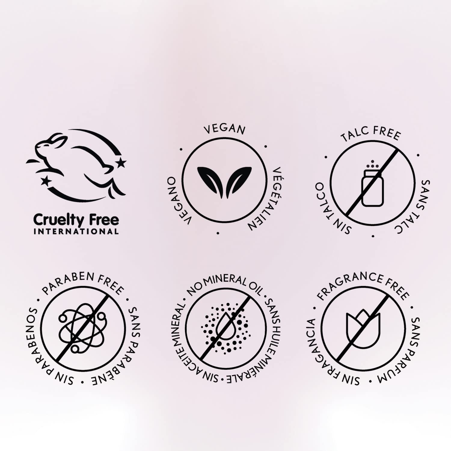 100% clean vegan formula free of talc, mineral oil, paraben and fragrance