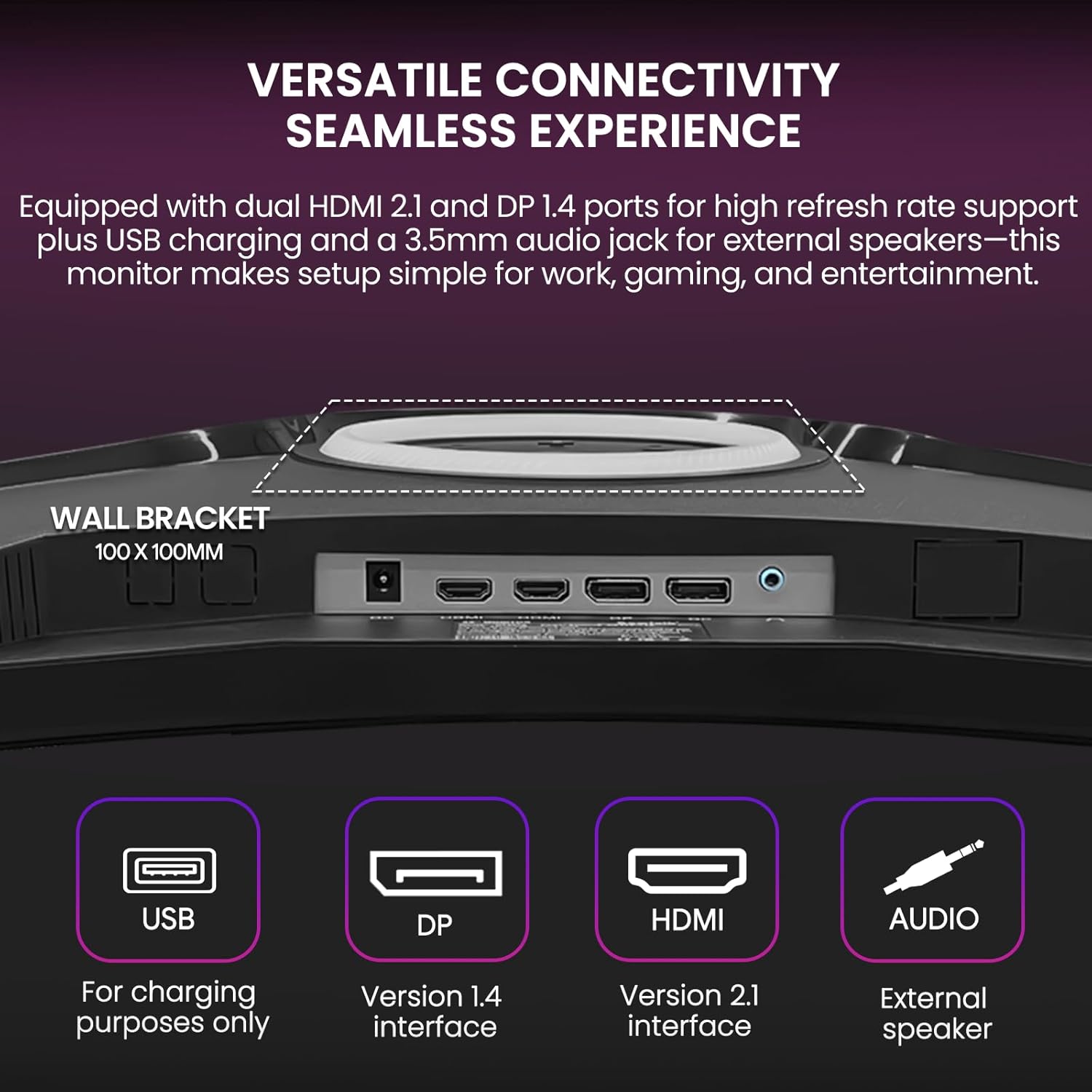 This 49-inch gaming monitor provides versatile connectivity with HDMI 2.1, DP 1.4, and an audio 3.5mm port. With a 100x100mm wall mount design, slim profile, and ergonomic size, it fits perfectly into any setup for gaming, work, or entertainment