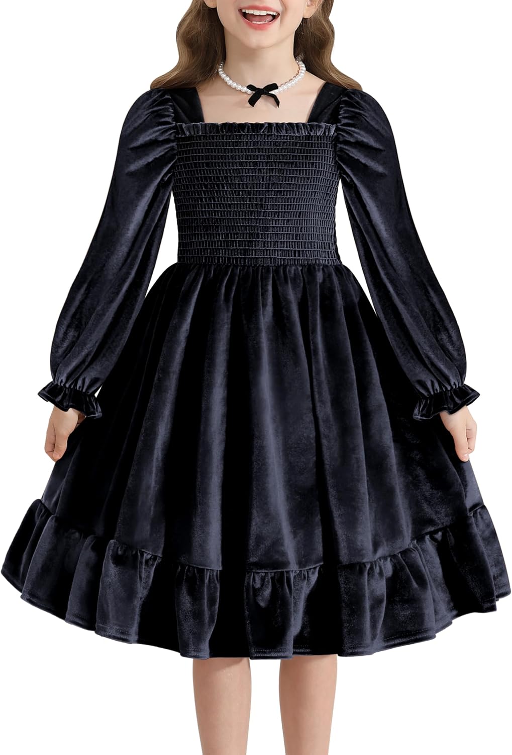 Cubear Toddler Girls Velvet Christmas Dress Puff Long Sleeve Square Neck Fall Winter Holiday Party Dress with Pockets 4-13Y