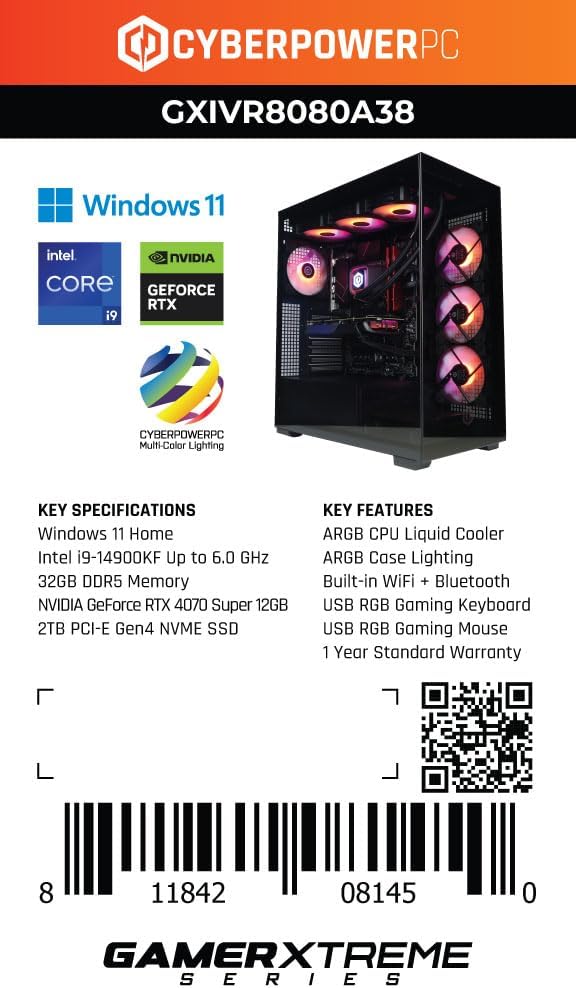 Specification: CYBERPOWERPC Gamer Xtreme VR Gaming PC, Intel Core i9-14900KF 3.2GHz, GeForce RTX 4070 Super 12GB, 32GB DDR5, 2TB PCIe Gen4 SSD, WiFi Ready & Windows 11 Home (GXiVR8080A38)