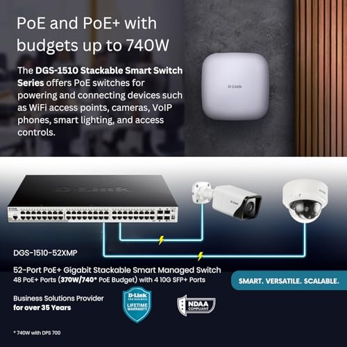 D-Link 52-Port Gigabit Stackable Smart Managed PoE+ Switch with 10G Uplinks | 48 PoE+ (740W) + 4 10GbE SFP+ Ports| L2+/L3 Lite |VLANs |Web Managed |Surveillance Mode | NDAA Compliant (DGS-1510-52XMP)