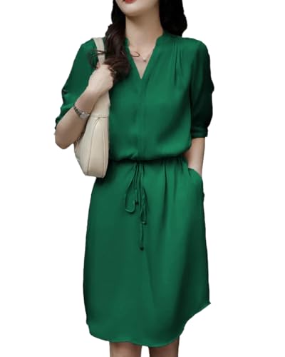 DAISYSILK Women’s Silk Shirt Dress Short Sleeve V Neck Drawstring Waist 90% Mulberry Silk Casual Summer Dress (US, Alpha, Medium, Regular, Regular, Dark Green)