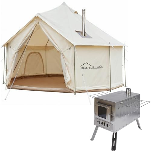 DANCHEL OUTDOOR B6 4 Season Glamping Wall Tent w/Large Wood Stove Camping, No Center Pole, Higher Side Wall, 900D Flame Retardant Oxford for 4 Person Yurt Cabin Tent,13ft/4m