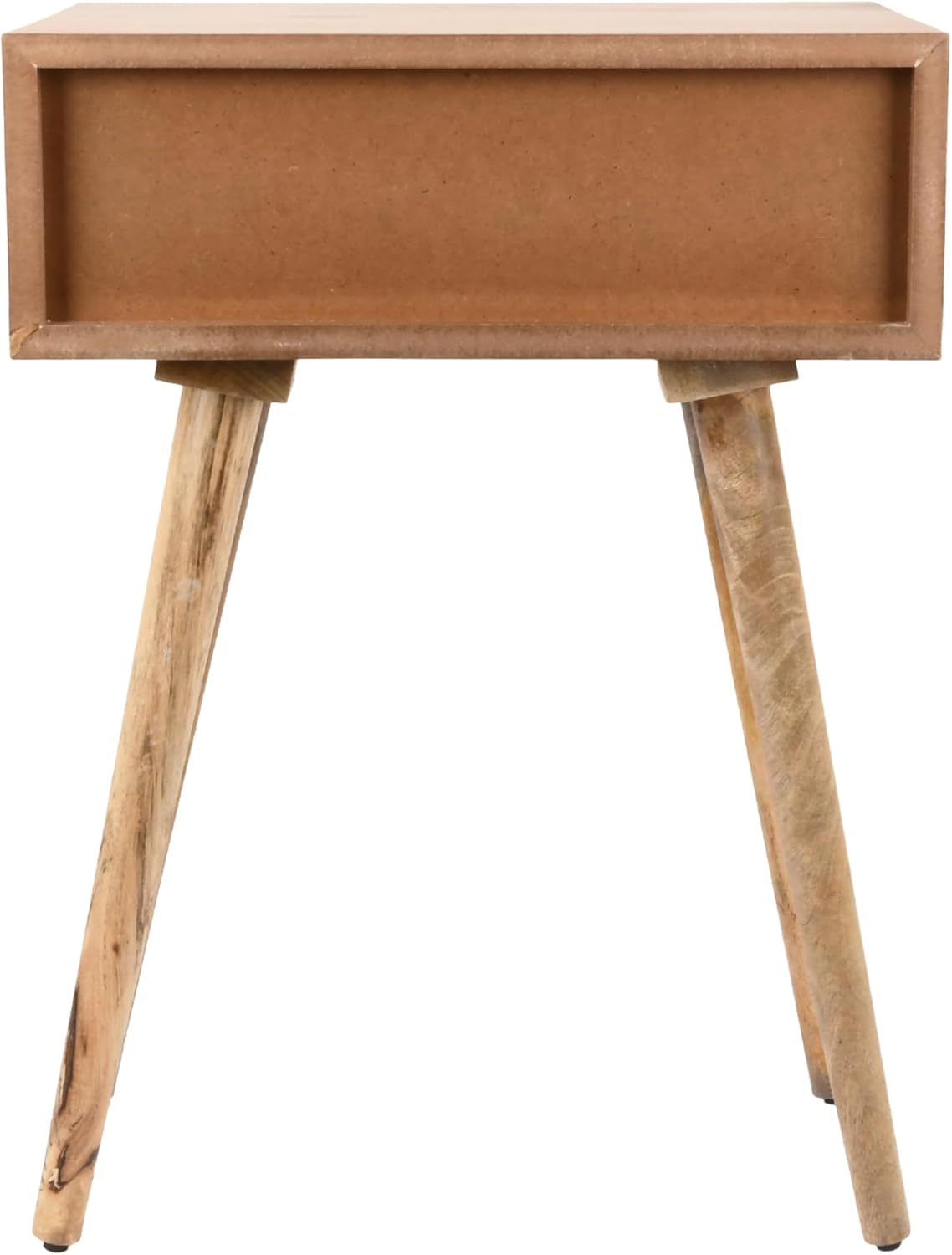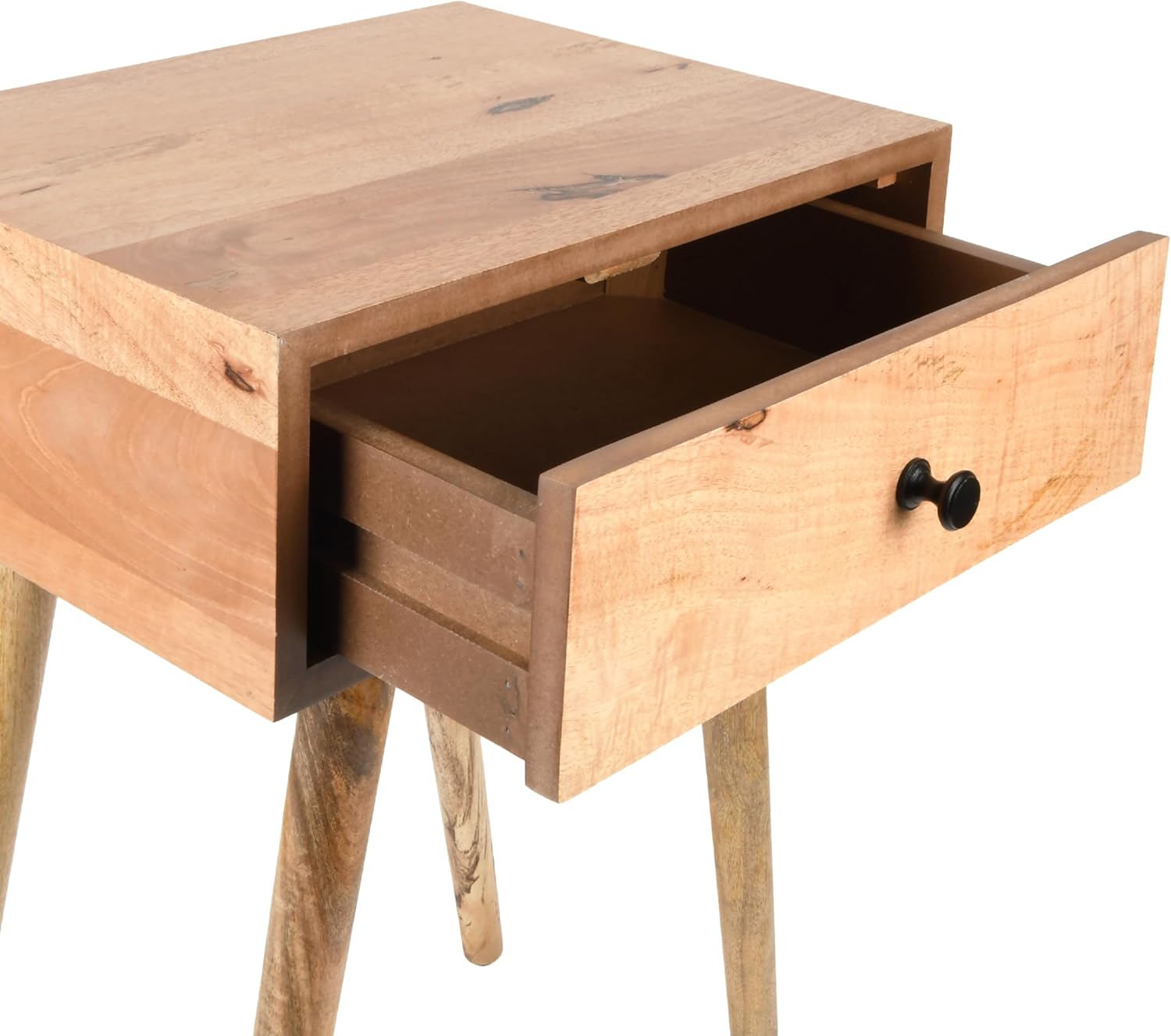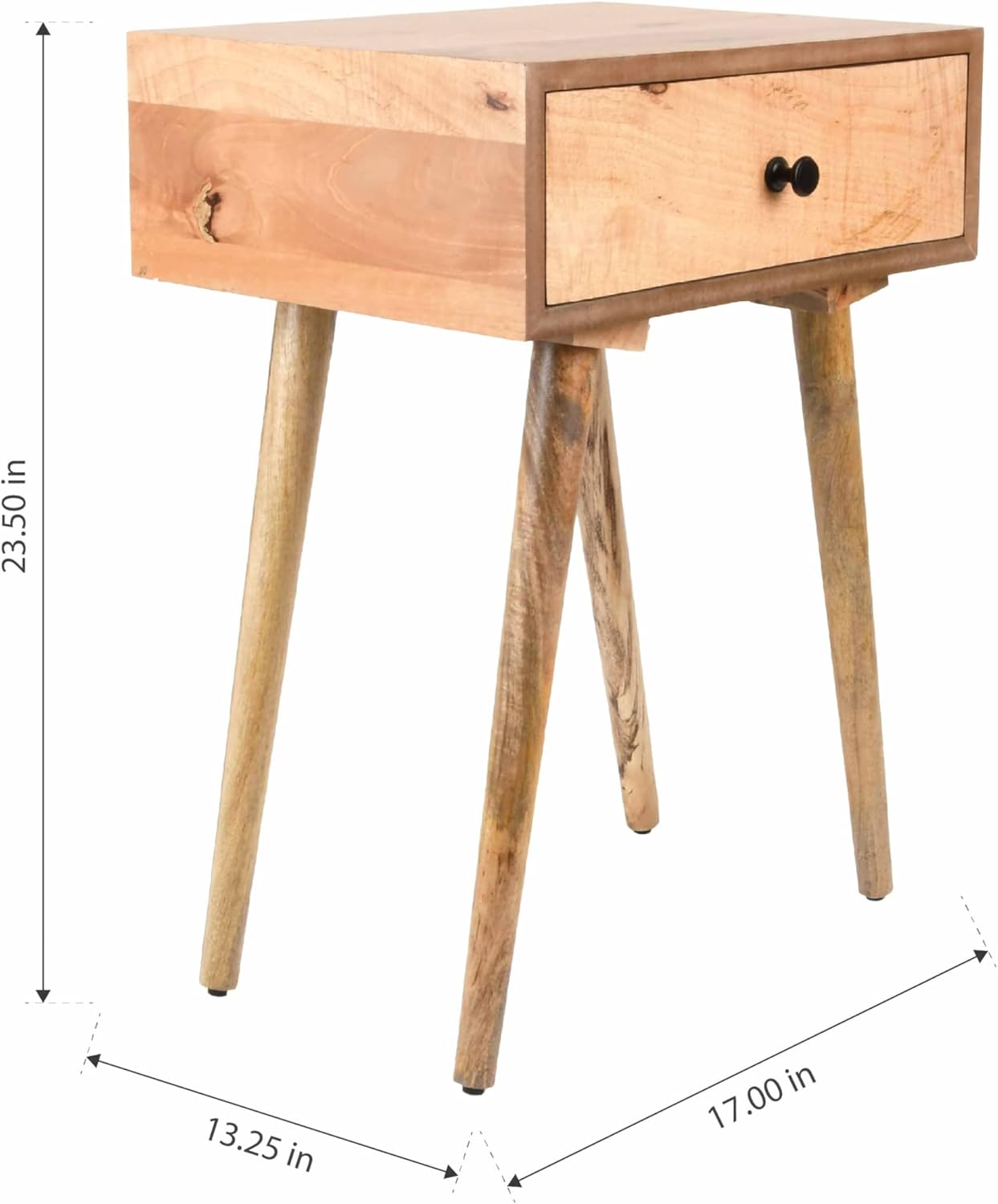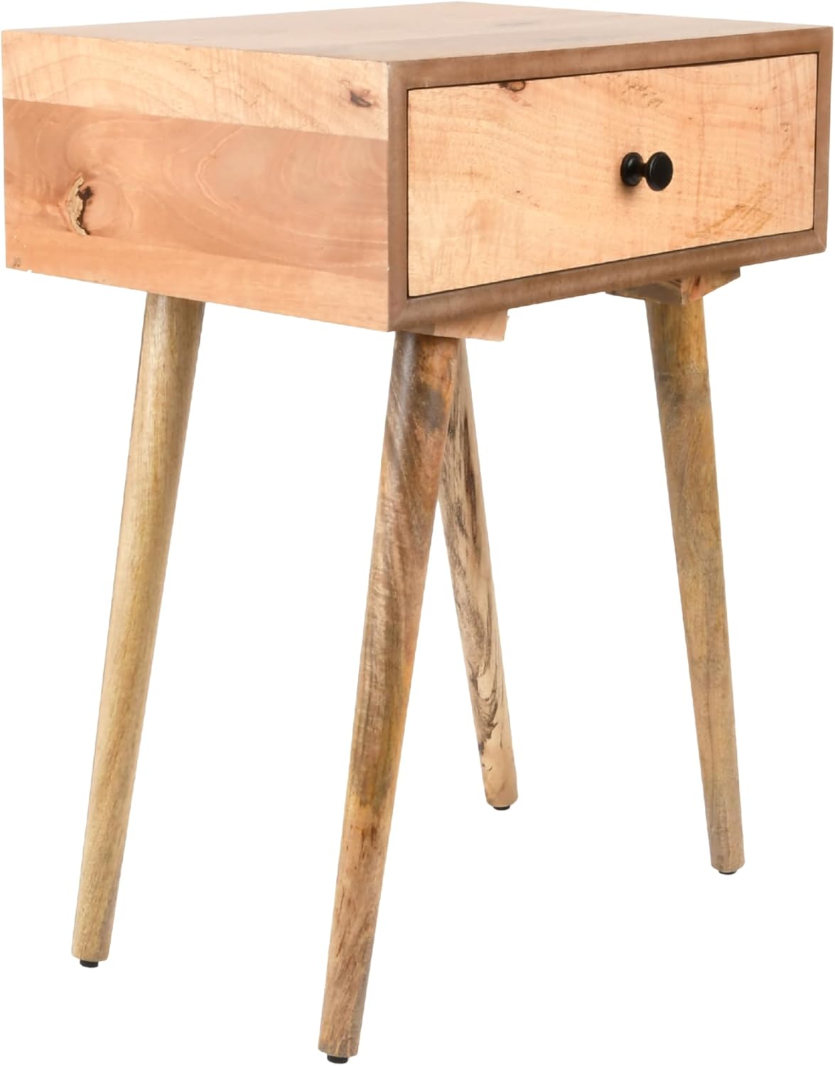 Introduce a touch of timeless elegance to your living room, bedroom, or dorm room with the Decor Therapy Mid-Century Side Table. This stylish accent piece embodies the essence of mid-century modern design with its clean lines, warm Natural Wood finish, and sleek black hardware. Features include hardwood solids and veneer construction, one storage drawer, and tapered legs. The versatile design complements numerous home décor styles, adding a touch of sophistication to your space. Keep clutter at bay with the convenient single drawer, perfect for storing small essentials like books, remotes, or phone chargers. The Decor Therapy Mid-Century Side Table in Natural Wood is an extremely versatile furniture piece that can be utilized as a side table, nightstand, or accent table.