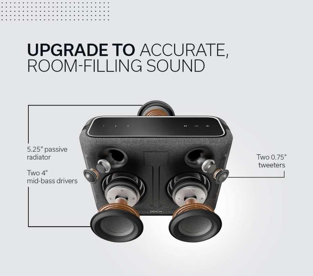 HI-RES AUDIO, WITHOUT THE HI-FI SYSTEM – Featuring (2) dynamic 0.75″ tweeters, (2) 4″ bass drivers, a 5.25″ passive radiator & sound master tuning, the Denon Home 250 gives you clear highs & deep lows for an exceptional sound quality from a single speaker
