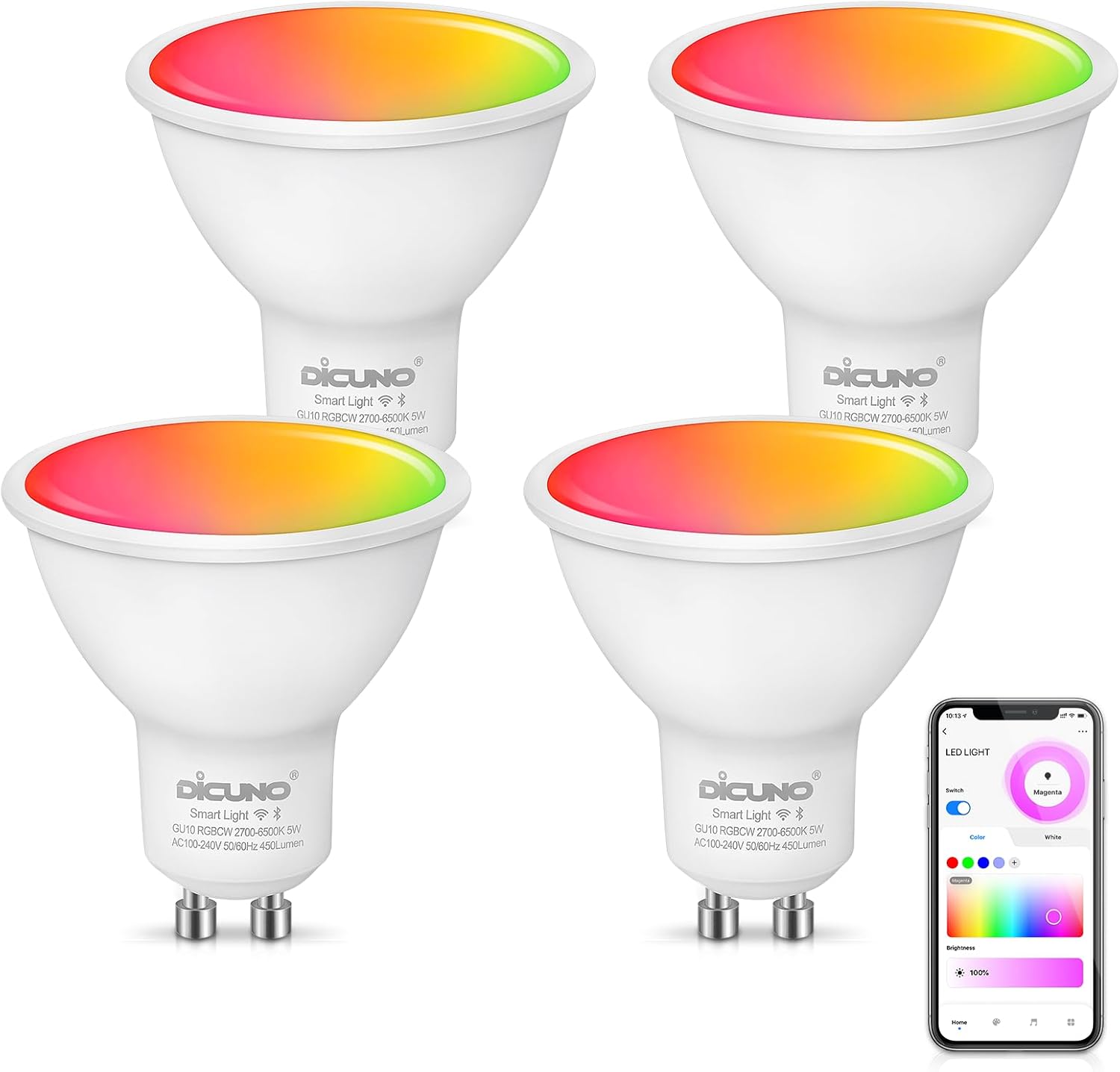 DiCUNO Smart GU10 LED Bulb, RGB Color Changing LED Compatible with Alexa & Google Home, Dimmable with App, 450LM, MR16 50W Track Light Bulb Replacement, 110° Beam Angle, 2.4GHz WiFi, Pack of 4