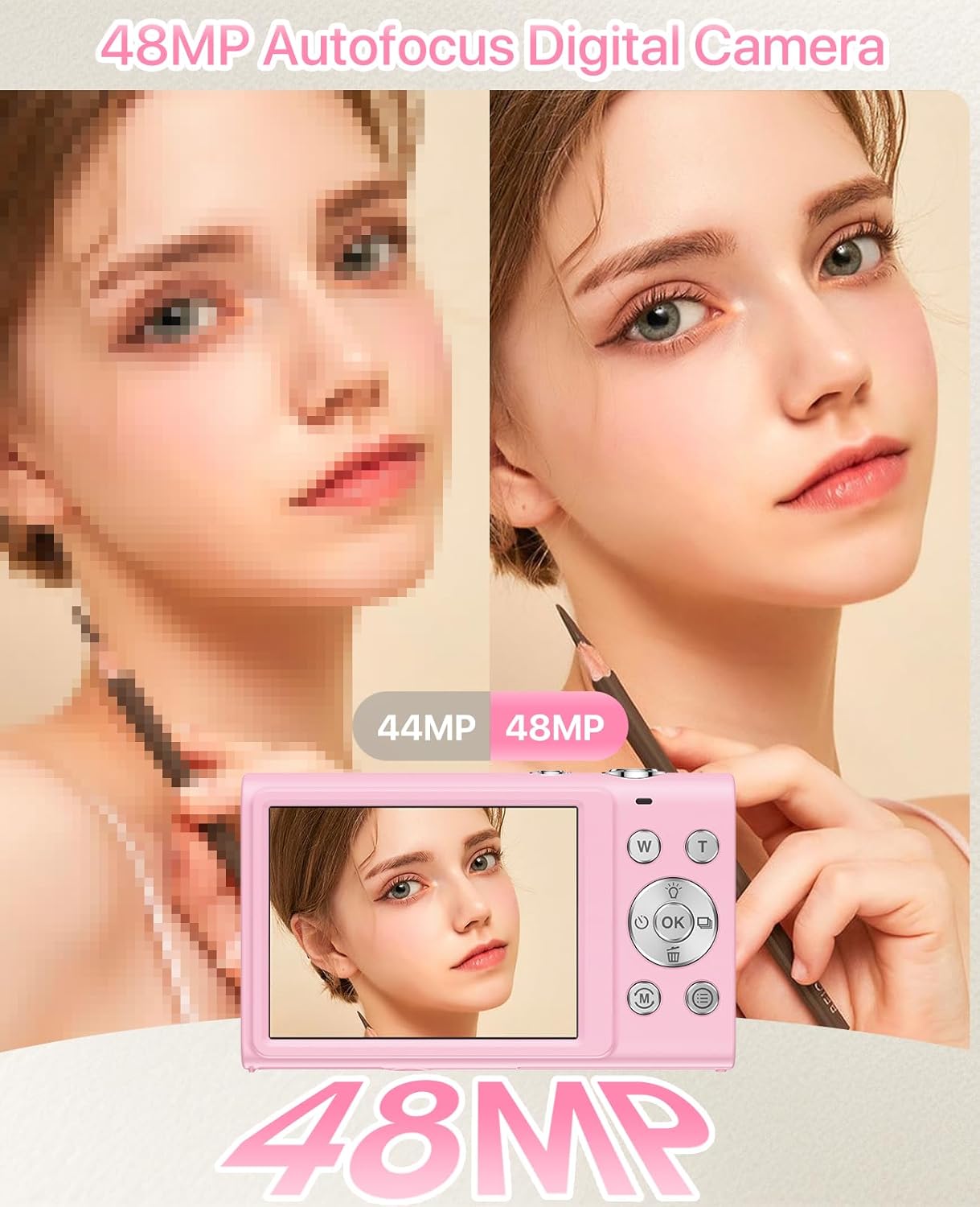 Digital Camera, 4K Vlogging Camera for YouTube Autofocus Cameras for Photography with 16X Digital Zoom, 48MP Compact Point and Shoot Digital Camera for Teens Adult with 32GB SD Card, 2 Batteries-Pink