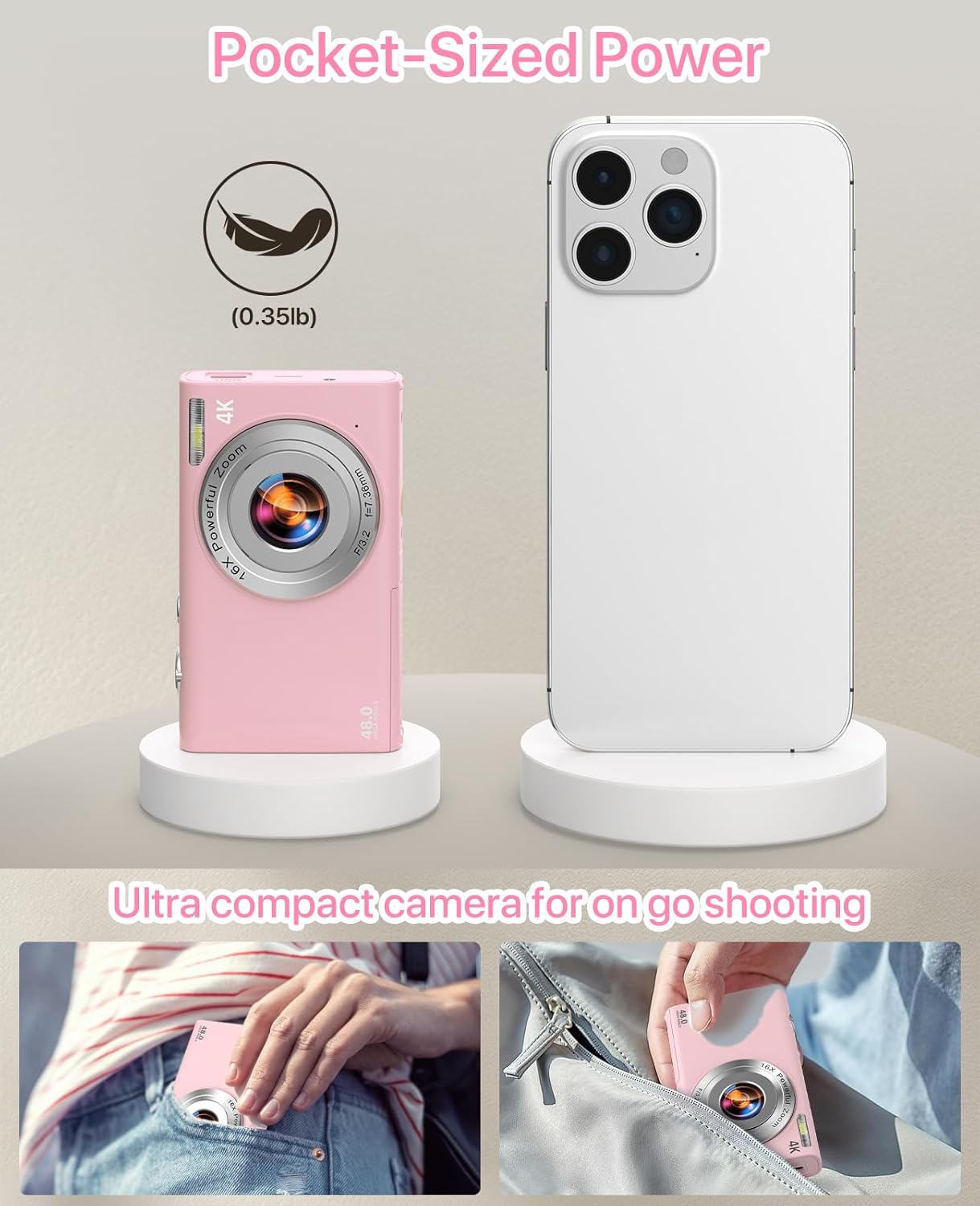 Specification: Digital Camera, 4K Vlogging Camera for YouTube Autofocus Cameras for Photography with 16X Digital Zoom, 48MP Compact Point and Shoot Digital Camera for Teens Adult with 32GB SD Card, 2 Batteries-Pink