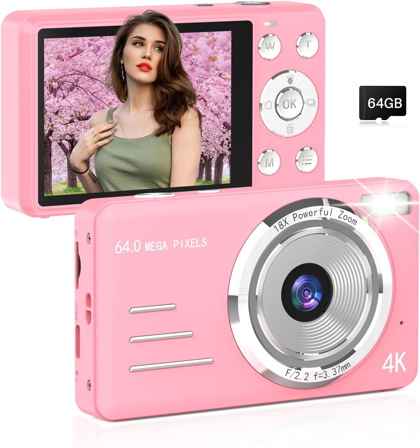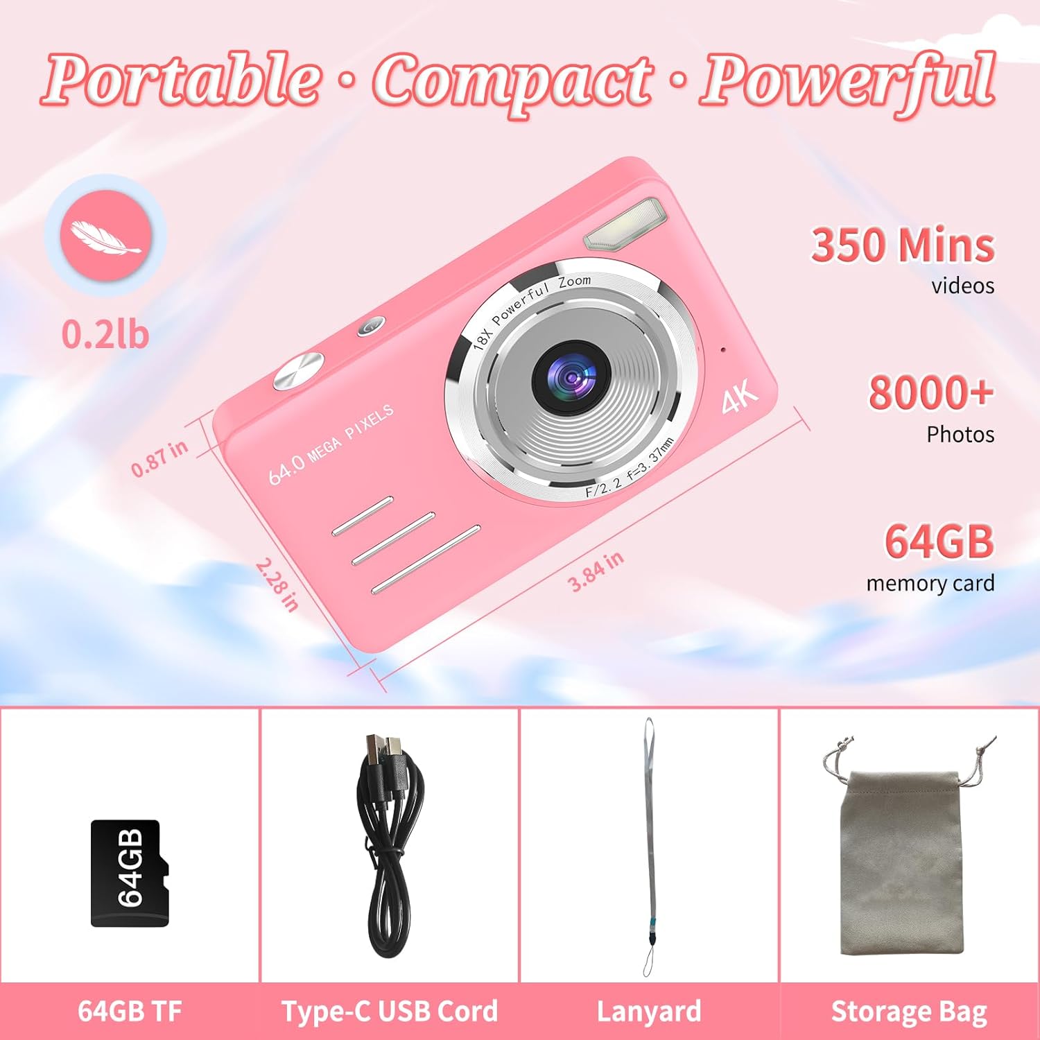 Digital Camera, FHD 4K 64MP Point and Shoot Kids Digital Camera with 64GB Card,18X Zoom, Anti Shake, Compact Small Cameras for Kids Gifts for Teens Girls Boys